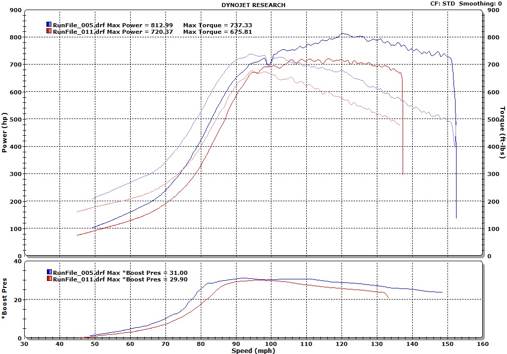 Dyno today at DB made 812/737. Not too shabby! Dyno graph comparing last year to this year. More power everywhere!