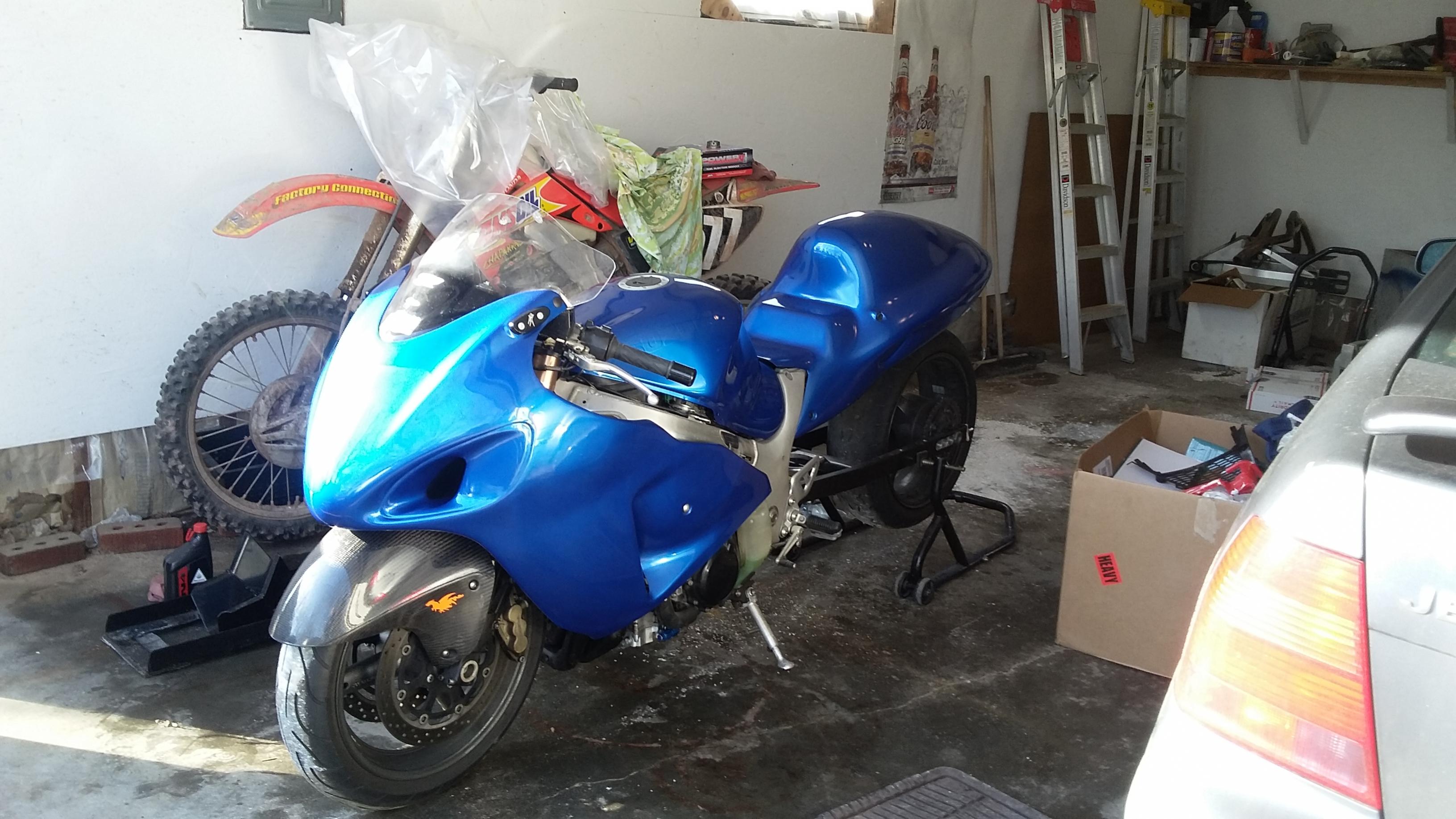 Painting in the garage at home. Iam going to paint the tank and the front fairing hopefully this weekend. If they turn out better then the tail I will strip the tail down and redo it.