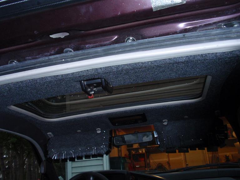 My headliner has been in shambles since I've owned this car. Right where it meets the rear hatch, it was falling down to the point of blocking my view from the rear view mirror. For the last few years, my answer to that was stick somewhere around 30 flush thumb tacks all over to keep it up and out of my way.