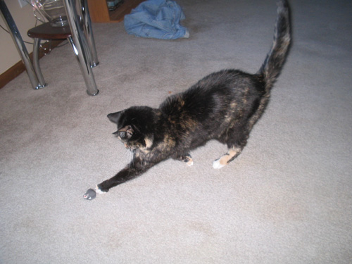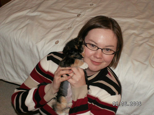 That's right, we are proud parents of another cat (kitten). AJ and I picked her up tonight from the Golden Valley Humane Society. Her name is Florin (not our choice, but it's kind of cute... we call her Flo for short). She's only 10 weeks old, so she's got that kitten spunk in her.