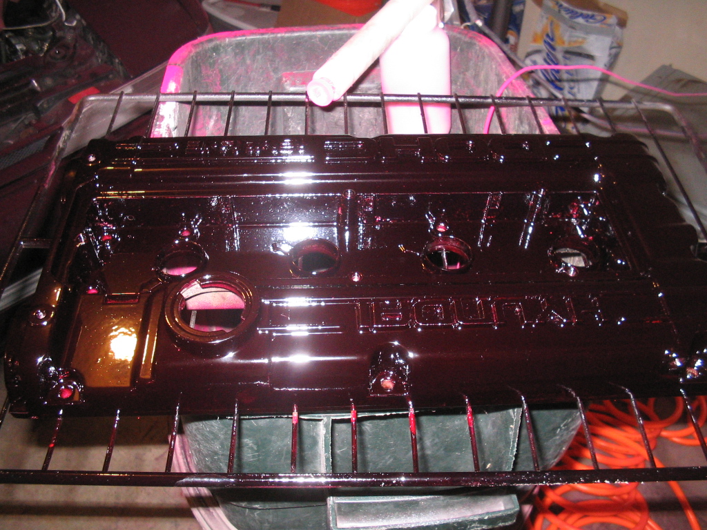 But since it came off, I had a Hyundai cover laying around that I'm going to be throwing on the car. I've been trying to figure out how to make a color to match the Black Cherry color of my car. My idea was to use a transparent/candy red, but with a Gloss Black base coat instead of the typical white/silver/chrome base you'd typically use with a transparent/candy color. Here's the results. It looked like absolute crap before I coated it. I was actually a little worried on how it would turn out because of the poor condition the surface was in and I couldn't get a lot of crap off the surface because it was just caked on it, even after a couple hours of prepping it. But I think it turned out just awesome. If you're just looking at it dead on, it looks pretty much like a gloss black (like you'll notice in the 3rd pic), but once it gets some light on it, then you see the maroon look (like in pics 4+). I think I'll be doing all my piping this color as well. I'm real happy as this was my first attempt at using a transparent powder. Let me know what you all think!