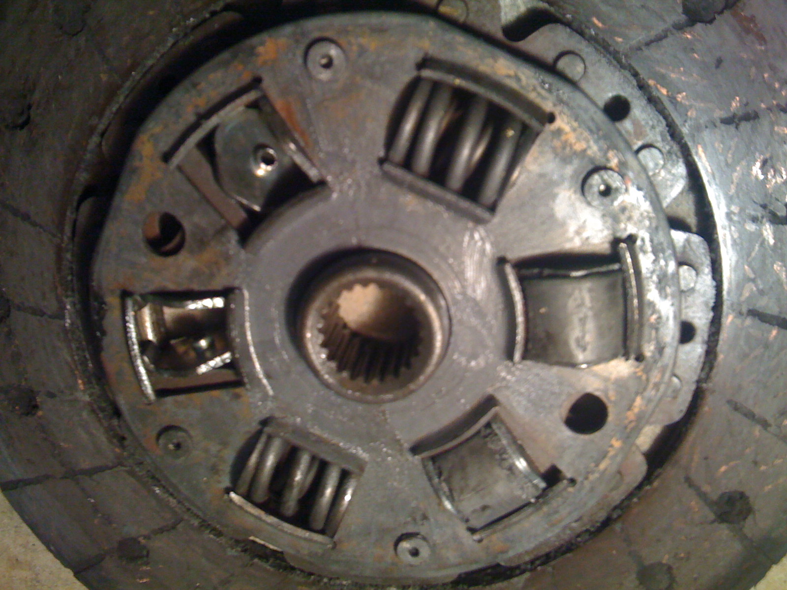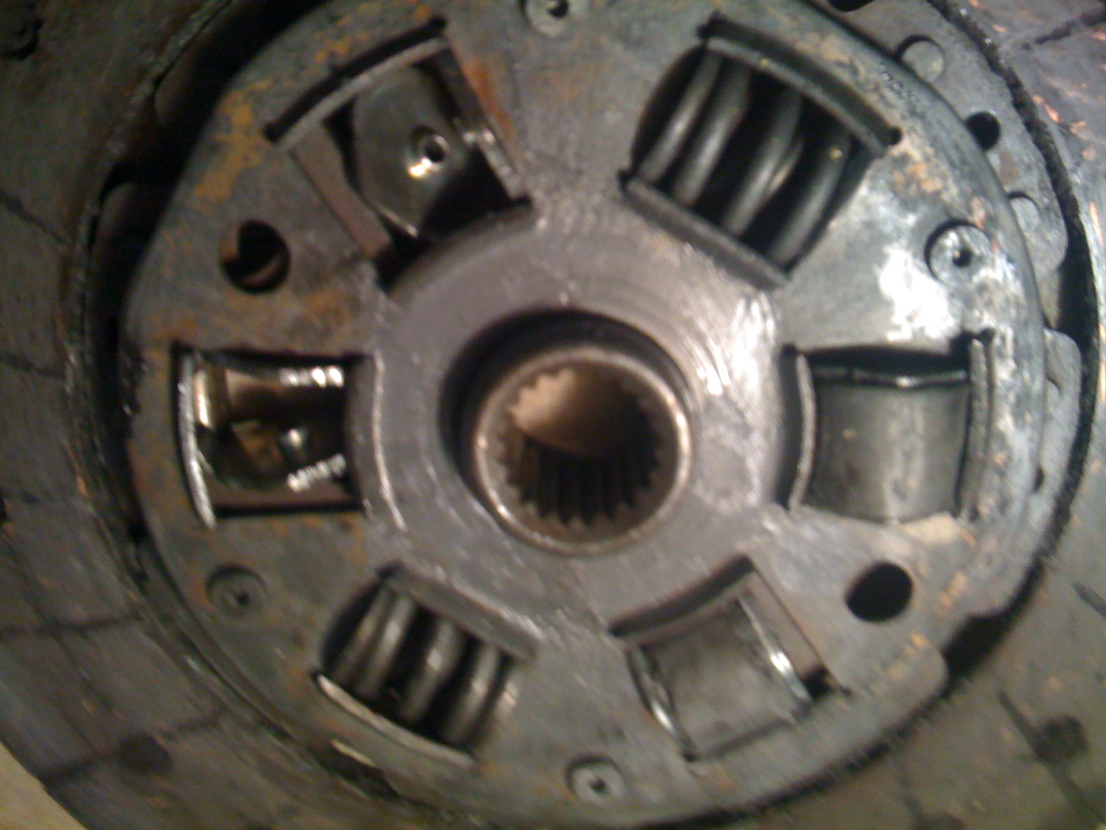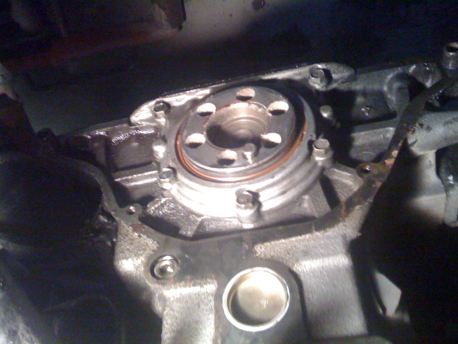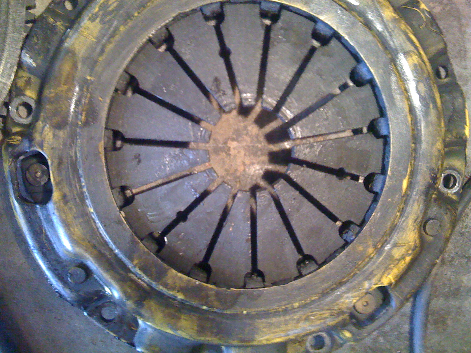 Today I had the time and the chance to tear apart my car and see what was going on and I found the problem with a surprise. There were 2/4 rubber parts on my disc that were completely gone and all over the inside of my tranny. My pressure plate was not tight to my flywheel with one bolt loose and scratching an arc in the inside wall of the tranny. And the surprise was this plug behind the flywheel that holds oil inside the block, whhich for some reason has not loosened but doesn't have a tight seal so it has been pissing oil inside my tranny and coated my disk and clutch in oil. I have pictures to show you what has been going on.