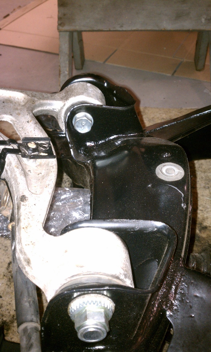 Started putting the rear sub-assembly back together. Really liking the fact that I bought new hardware to replace some of the rusty bolts. However they screwed up and sent me the wrong two cam-bolts for the lower control arm. So I have the old rusty ones in there for now until they send me the correct ones.
