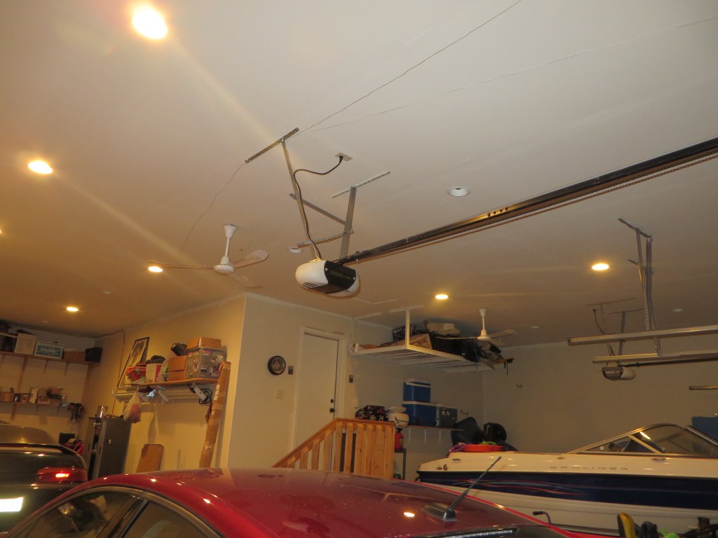 99.9% there. I have the two switches installed in the new location and wired up so one turns on half, and the other turns on the other half. I also have the fan switch wired up which controls all three fans. I do still need to anchor the fans (you can see the anchor cable still dangling). And then the ceiling portion of this project is pretty much done and time to come up with a plan for a new shelving/storage layout. Overall I'm very happy with how this turned out, but it did prove that I still need some sort of side/front lighting like my old fluorescents were. The garage is extremely well lit, but working under the hood of the car is dark.