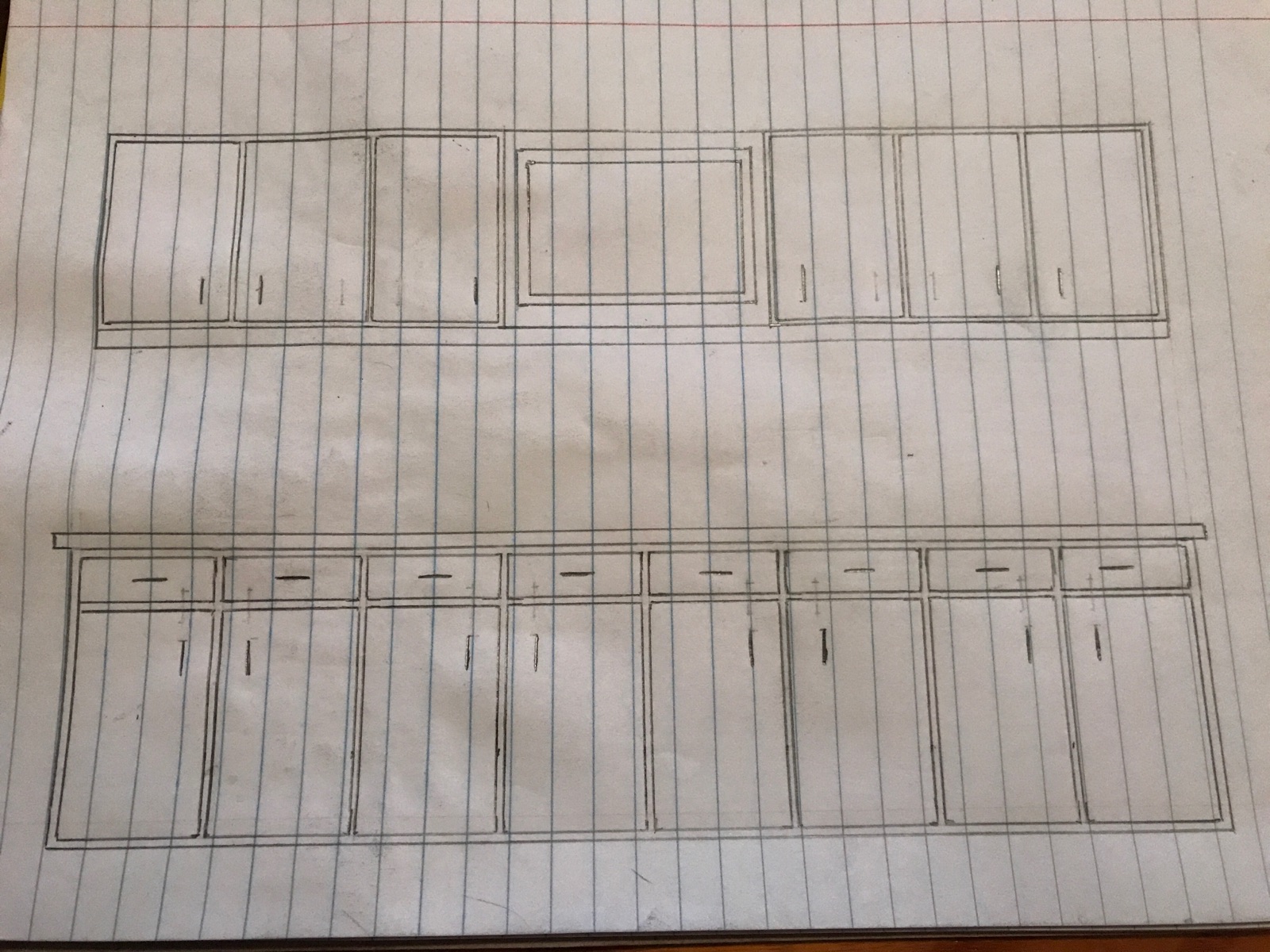 Also Jeremy (guy with Supra couple miles from me who has inspired me) made me a couple sketches for what I could do for custom cabinets that would fill the space pretty much perfectly. I really like his ideas. He has each cabinet at ~21.5" wide fitting an even 8 across. Then the upper cabinets just leave out the middle two for mounting a decent sized flat screen (Mr. Leisure you're my inspiration for that!!). I'll probably go with his second sketch which gives lots of cabinet room and also a bunch of drawers.