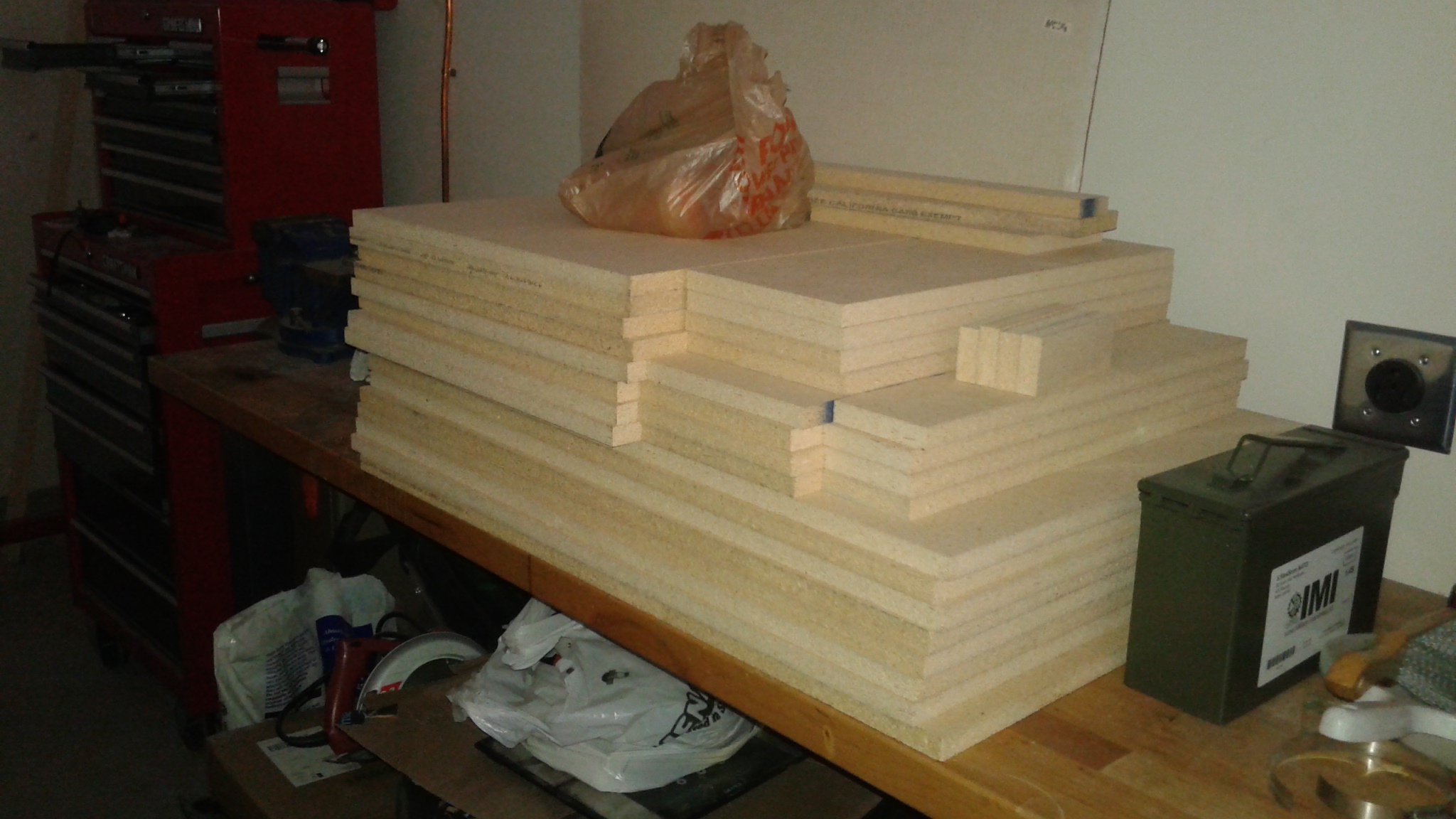 We took his van to Home Depot and picked up four sheets of 3/4" particle board for making the cabinet carcases out of and some other misc supplies (~$120 total). Threw em on his table saw and cut out the pieces to make the initial four lower cabinet carcases. I have them in my garage getting acclimated. Hopefully find some time to start assembling them in the next week or so. Pretty excited to finally start on these!