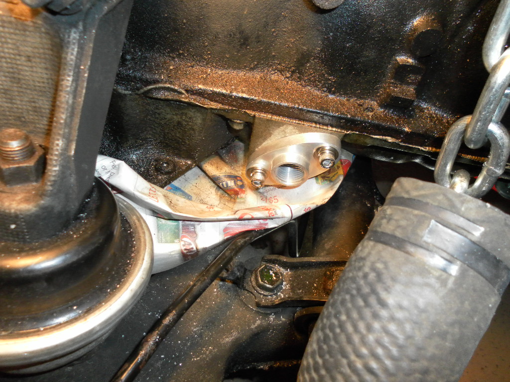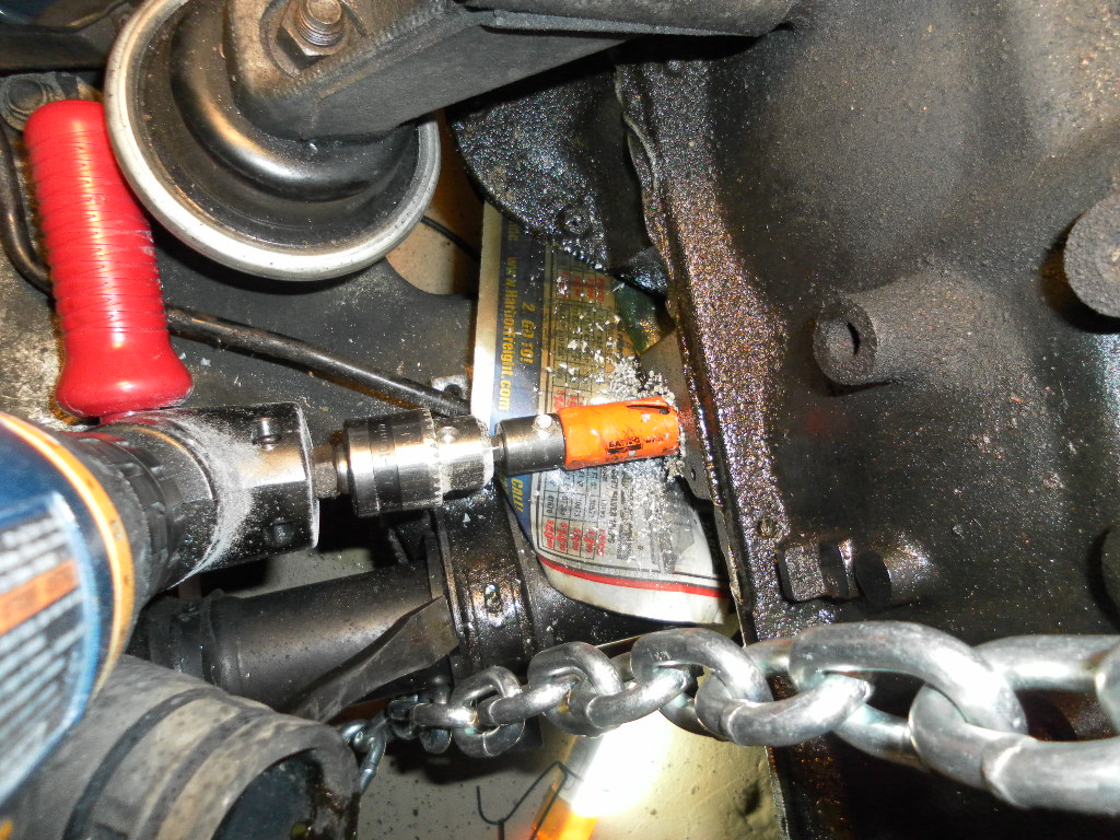 I was however able to just drop it as far as it will drop, and can slide some newspaper in there. You can see where I circled, that's where I need to drill for the oil drain line. So the newspaper should catch almost all of the metal flakes from getting into the lower oil pan.