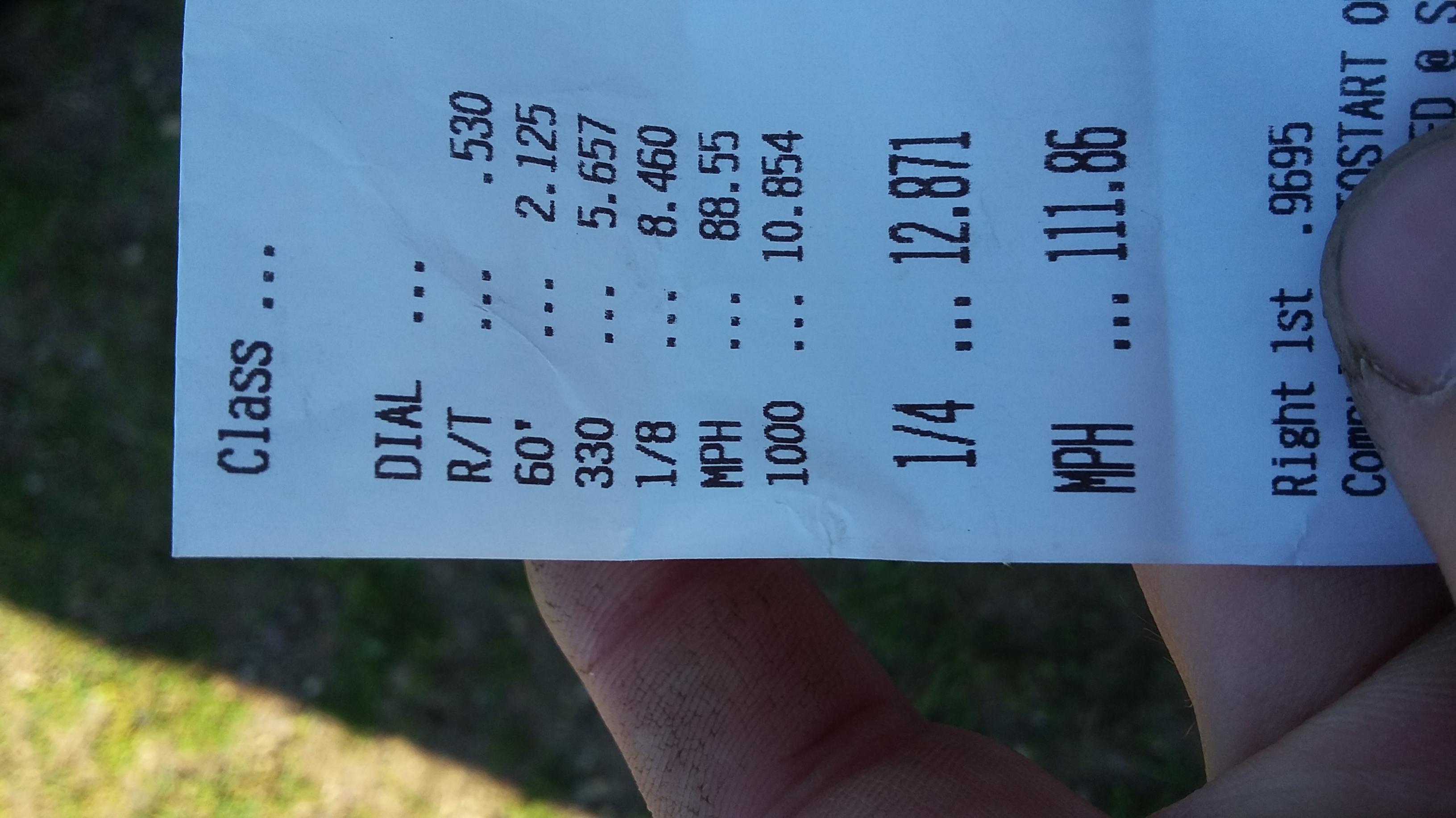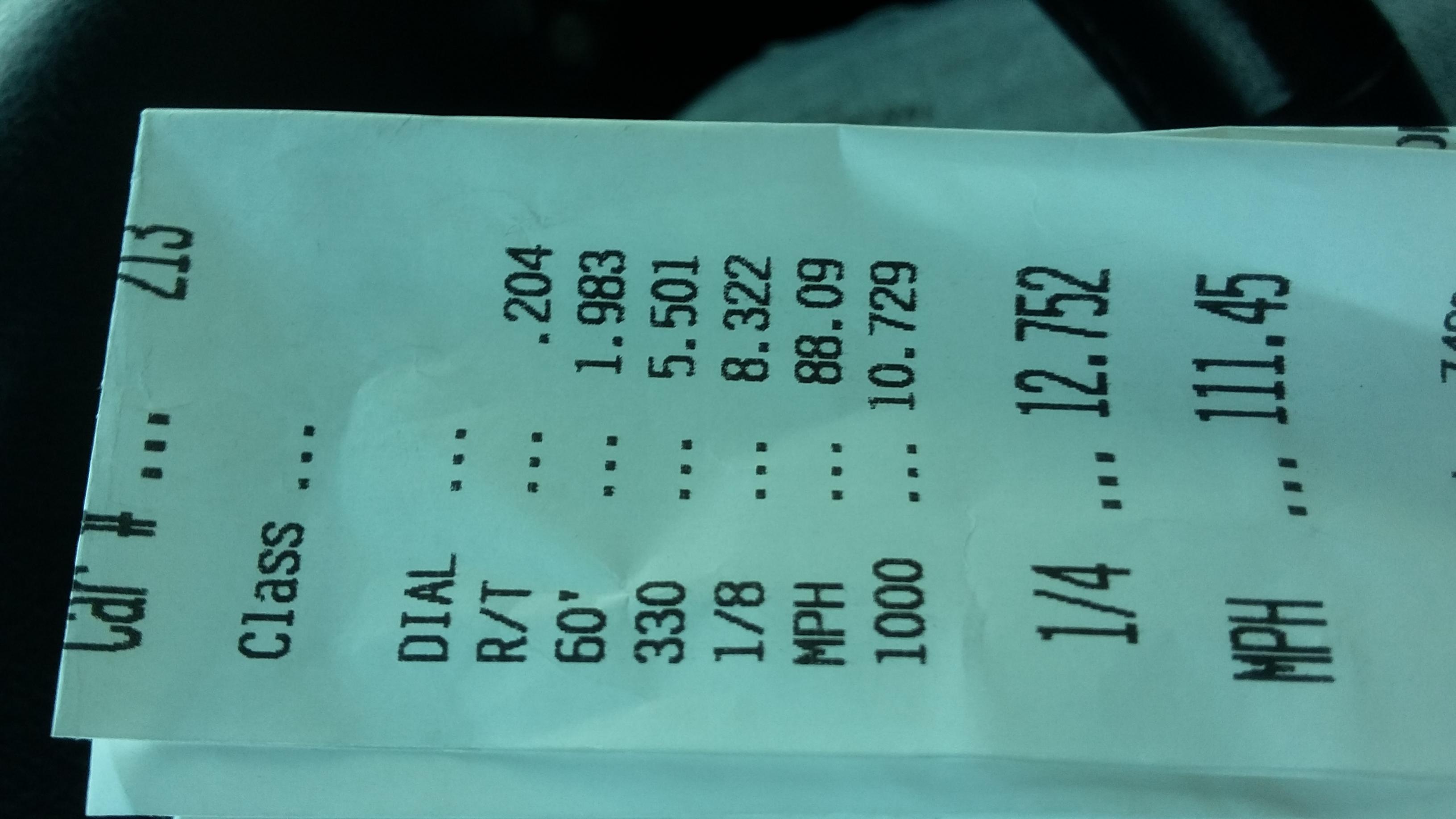 Well made it to rockfalls today. First pass in the left lane ran a 12.8. Second and third pass ran in the right lane were 13s. Spin both time in the right lane. So I went back to the left lane and made sure to do a good burn out. Ran a 12.9 and followed it up with a 12.75 then headed home.