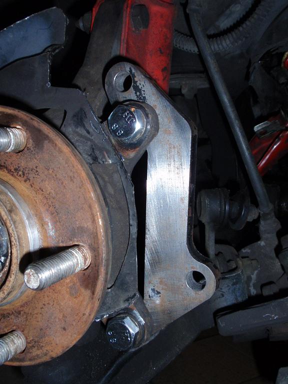 Had to cut away a little more of the dust shield. I used M12 x 1.75 x 25 bolts and lockwashers to mount the brackets to the car. 25 seemed to be a good length where it wasn't sticking out the back. Ideally I'd say a 30mm length would be ideal but Lowe's didn't have 30. 35 seemed a bit too long. I'm going to stick with the 25mm ones as they still are in there a good 4 threads deep.