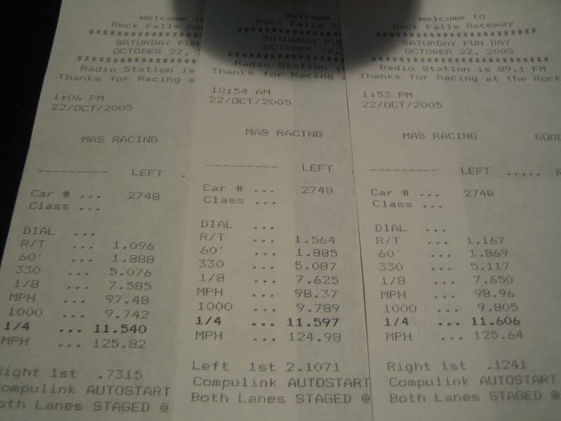 Well I was there too today at Rock Falls. Did even better than last weekend. Only problem was that i didn't have the laptop as the boss took it to Vegas with him to a convention. The only problem i'm having now is that i'll boost to around 26# in the beginning of a gear and it will crest off to just around 22.5# in the middle & top of the gears. I don't know if it's a boost leak or the internal wastegate. The run below isn't my best 60' today. I ran a 1.78 60' on a prior run. Overall I'd was very happy with my new personal best! I was shooting for a 11.99 but without the laptop, I was erroring on the side of caution with just a little palm pilot. Fixing whatever boost leak i have and staying at 26# will yield me the 11.99 and better. I made it to 2nd round of elims. That was gonna be my 11 sec run but I missed 3rd! I was upset. I already had almost a tenth in the bank at the 330' from my 12.05 run. 11's are there but it will have to wait till next year.