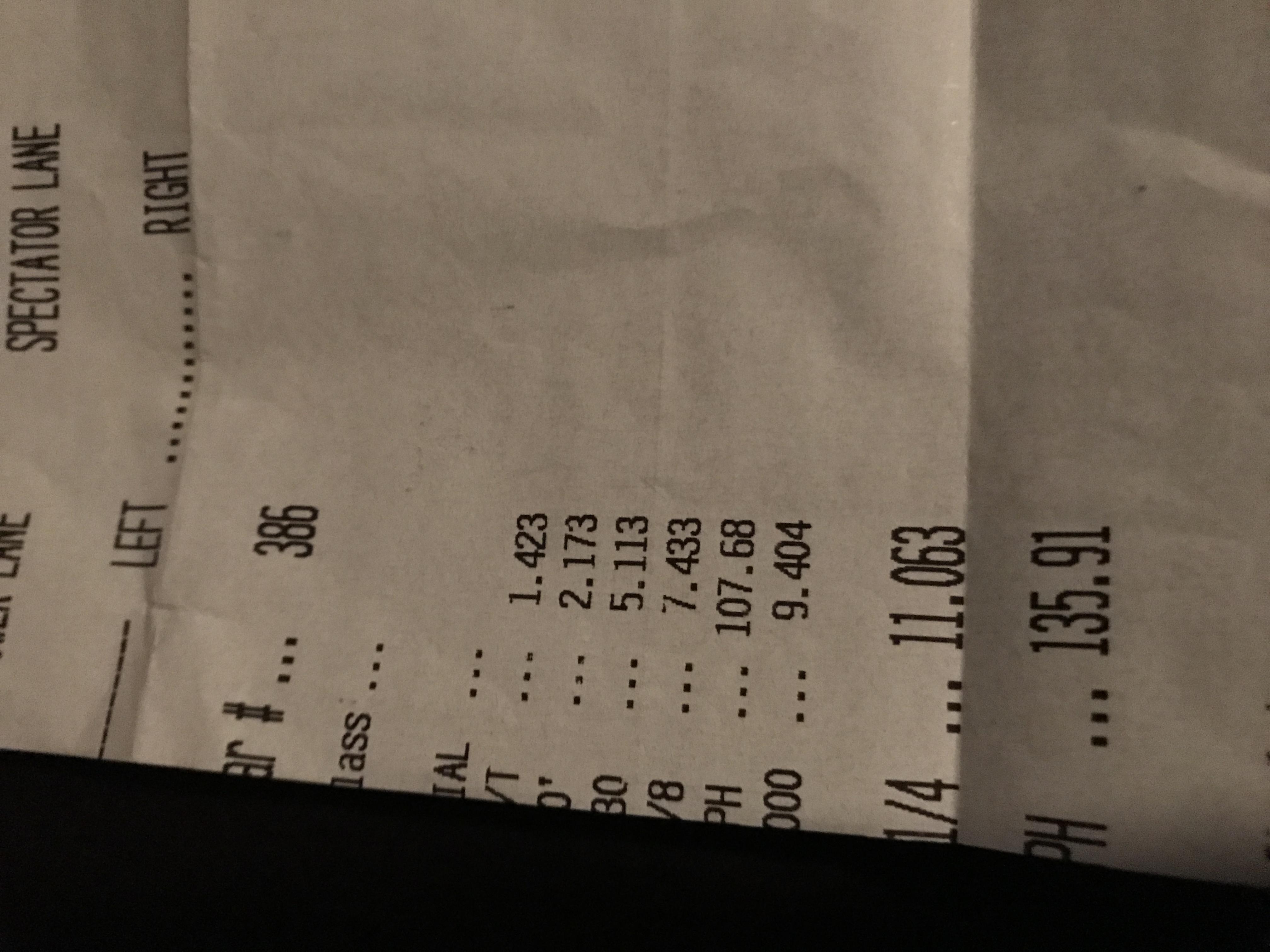 Havnt updated for awhile so heres a little news. Car has been running amazing with no problems and i cant say how happy i am to be able to say that lol. Made it to pg2 a couple weeks ago and got to see what it could do in the 1/4 or atleast what i can do with it. Fastest time i got was a 11.3 at 128 with not to hard of launching. Looking forward to making more passes by the end of the season with a goal to get a 10sec pass.