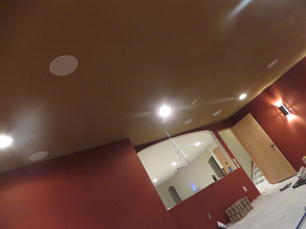 I think that's about it for now. Tomorrow we will be painting the screen. Coat of primer, and then probably 2 coats of the Sherwin Williams paint I linked to earlier. Not sure what else he has planned for tomorrow, but here's what I see is left. Finish up low voltage stuff, install wood trim, build and install wood counter top (he said the bar top won't be done by super bowl unfortunately), carpet (scheduled for Friday), then basically just move all the components into the room and clean the shit out of everything because of all the dust that's been created.