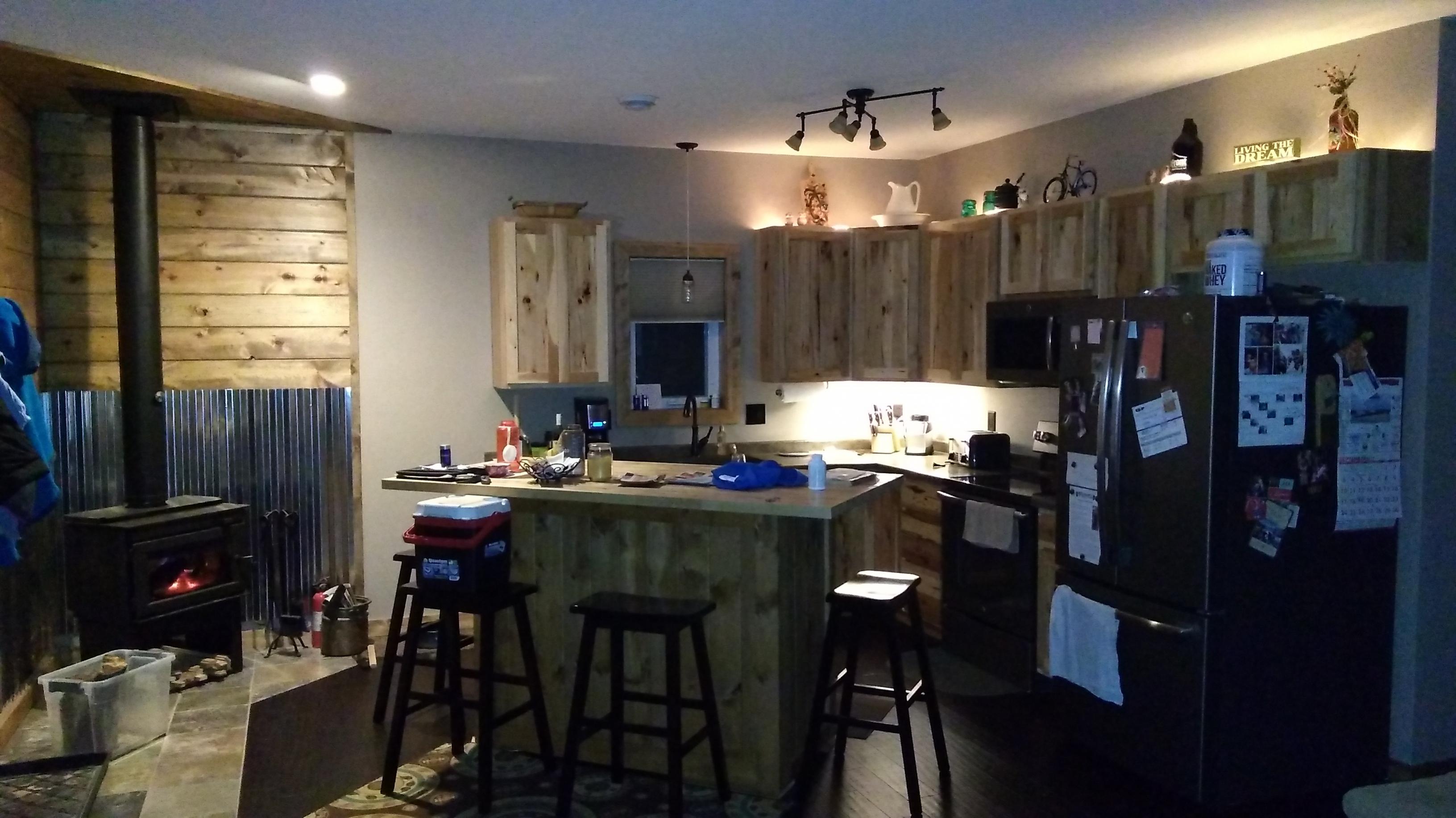 I took on my kitchen and living room for a remodel this yr. I think my upstairs and bathroom will be happening next yr, plus with all the freebies I've picked up looking to do a budget sauna possibly in spring. In the mean time enjoying my new wood stove on a cool night. Moved the window over the kitchen sink over 3', removed a large picture window and replaced it with a.sliding patio door, removed a entry door on the north side of the house and cut in a new window in centered on the wall. Just finished siding repairs this past weekend and added supports for my deck extension for next yr.
