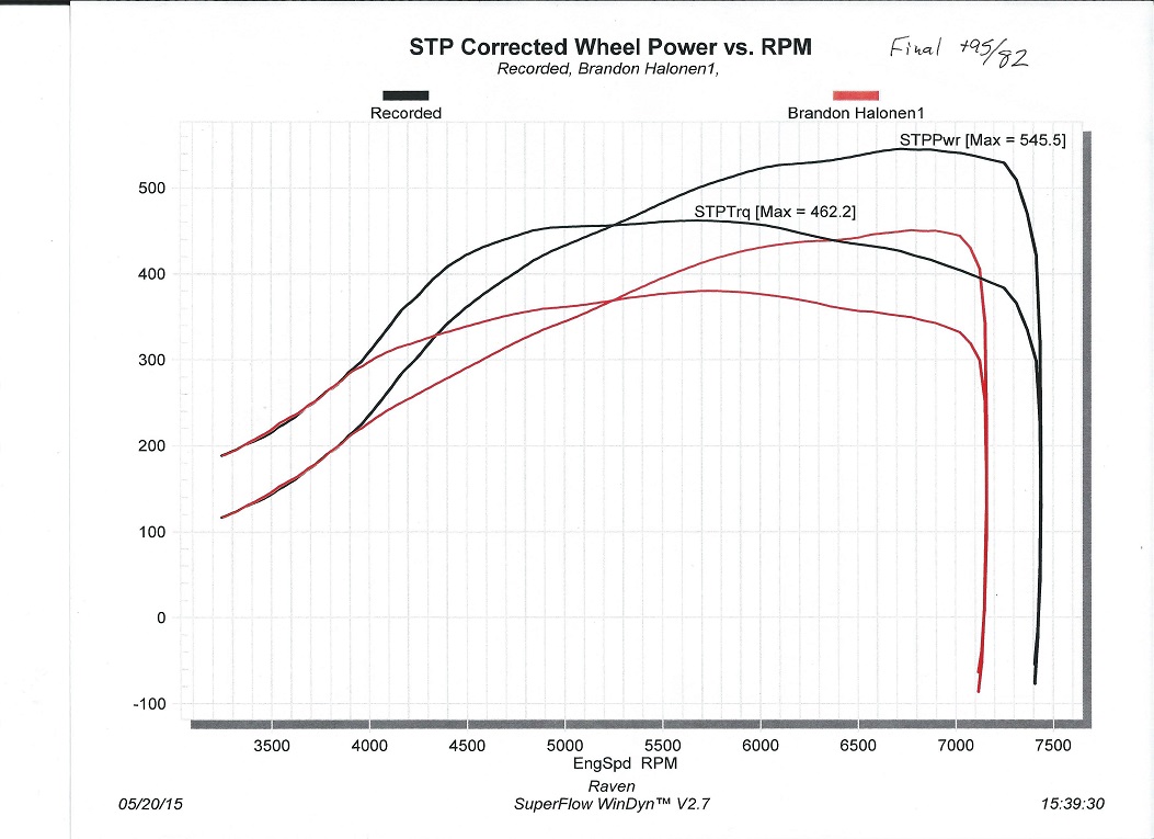 RavenWorks dyno session today went extremely well with Bob. 1st pull was on WG only boost (10psi creeping to 13psi). Pull was smooth, zero issues, and made 450hp/380tq. Over the course of the next 2hrs or so, we had it up to 20psi. We were trying to keep it at a decent yet conservative boost level, and same conservative mindset for the tune, don't shoot for the moon. Ended up at 545hp/462tq @ 20psi (falling to 17psi by redline). Full boost around 4300rpm, rev'd it out to 7600rpm (again, conservative redline). These are heart breaker SuperFlow numbers (probably closer to 575 on a DynoJet). Also the WB reading were off by about .5-.6, we were actually right around 12.1. Extremely happy with the results. Car never skipped a beat the entire time, ran absolutely flawlessly. That's plenty for me to have fun with this season, so just leaving it at that. Next year if everything holds together, I'll go for more.