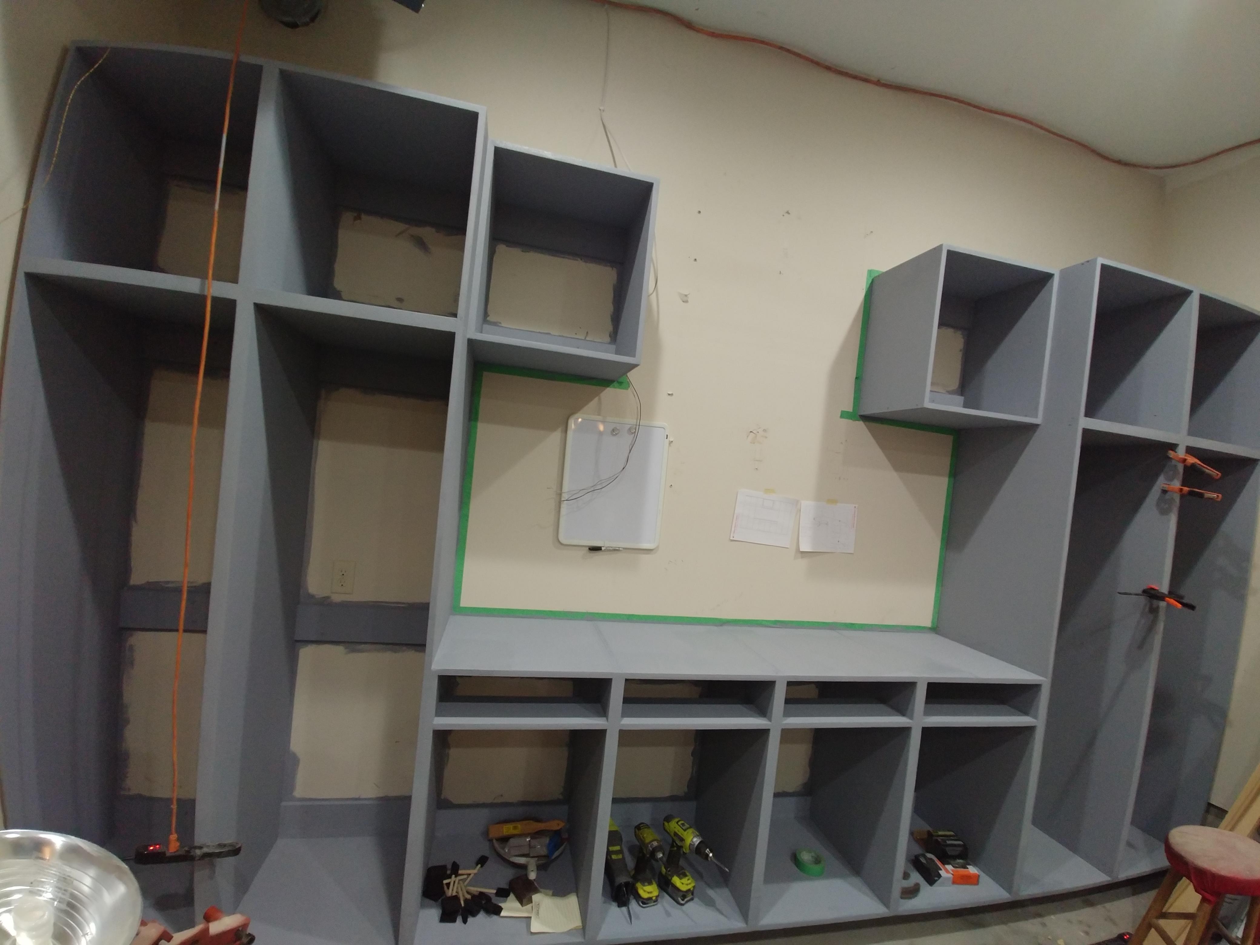 Painting on the casings is complete. Went with a dark grey semi-gloss. Pretty happy with it. Now to start adding shelves.