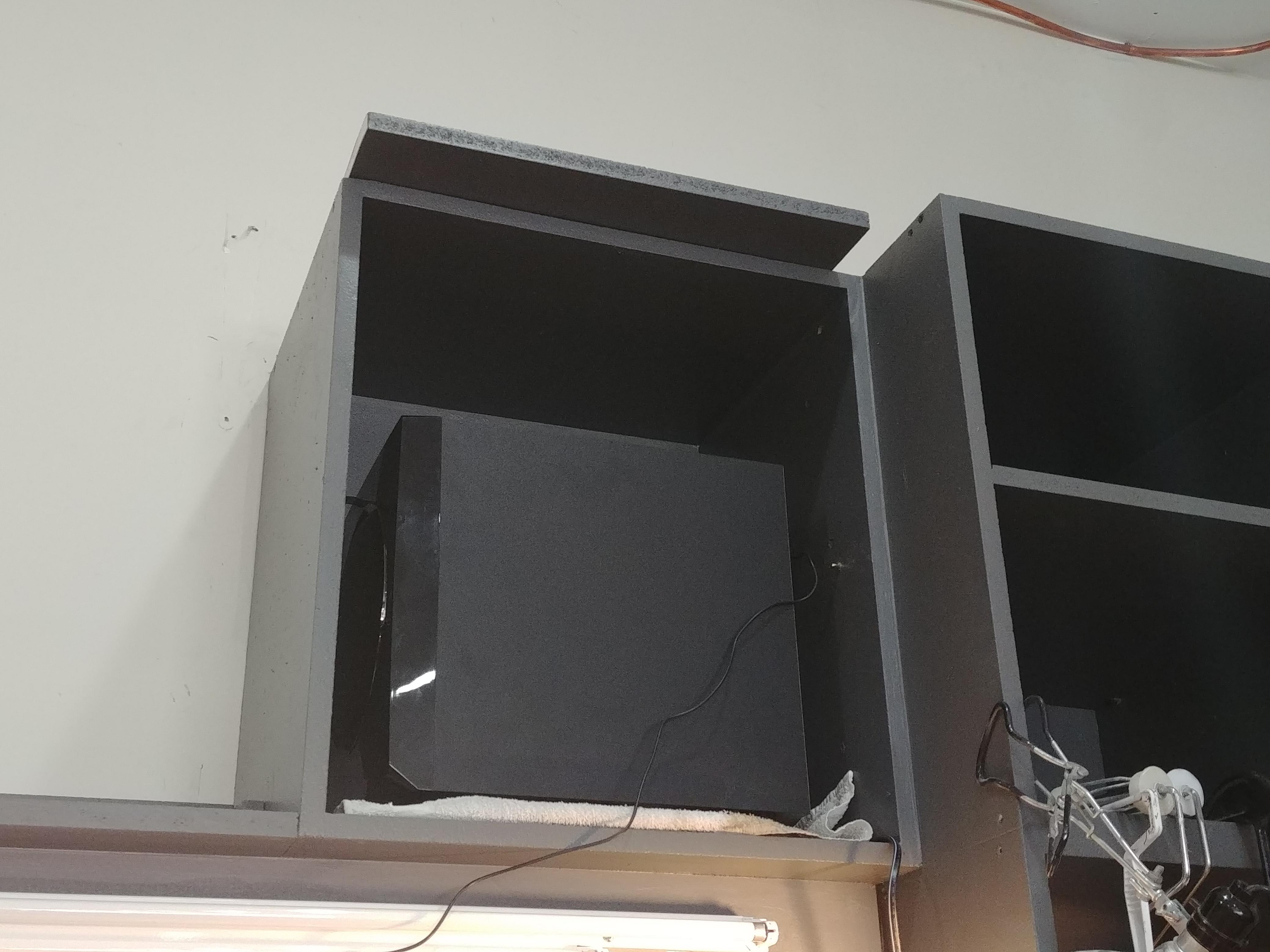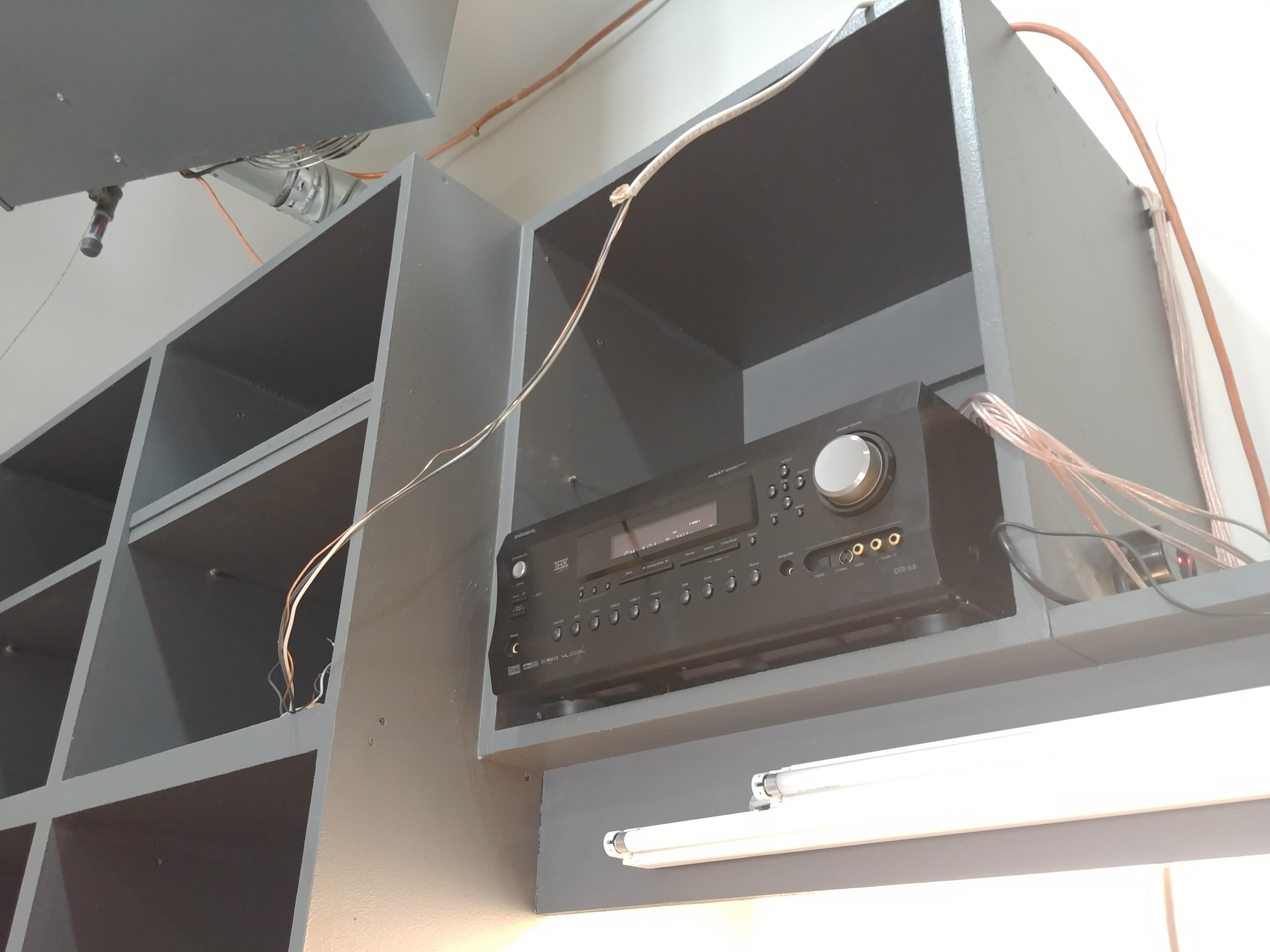 Well i took the day off work to get stuff done. I got the ceiling speakers mounted and wired. They sound ok, plenty loud, but really lacking bass. But thats ok because the sub helps there. I tried a bunch of different sub locations and configurations. One of the small upper cubbies fits it perfect and is the best sounding spot i tried. I also grabbed this receuver for free from my buddy who has been helping me. I think this will be the final configuration. Because the receiver is so deep i cant put a door in this spot, so im just going to leave these spots doorless. With the sub, the sound is awesome!