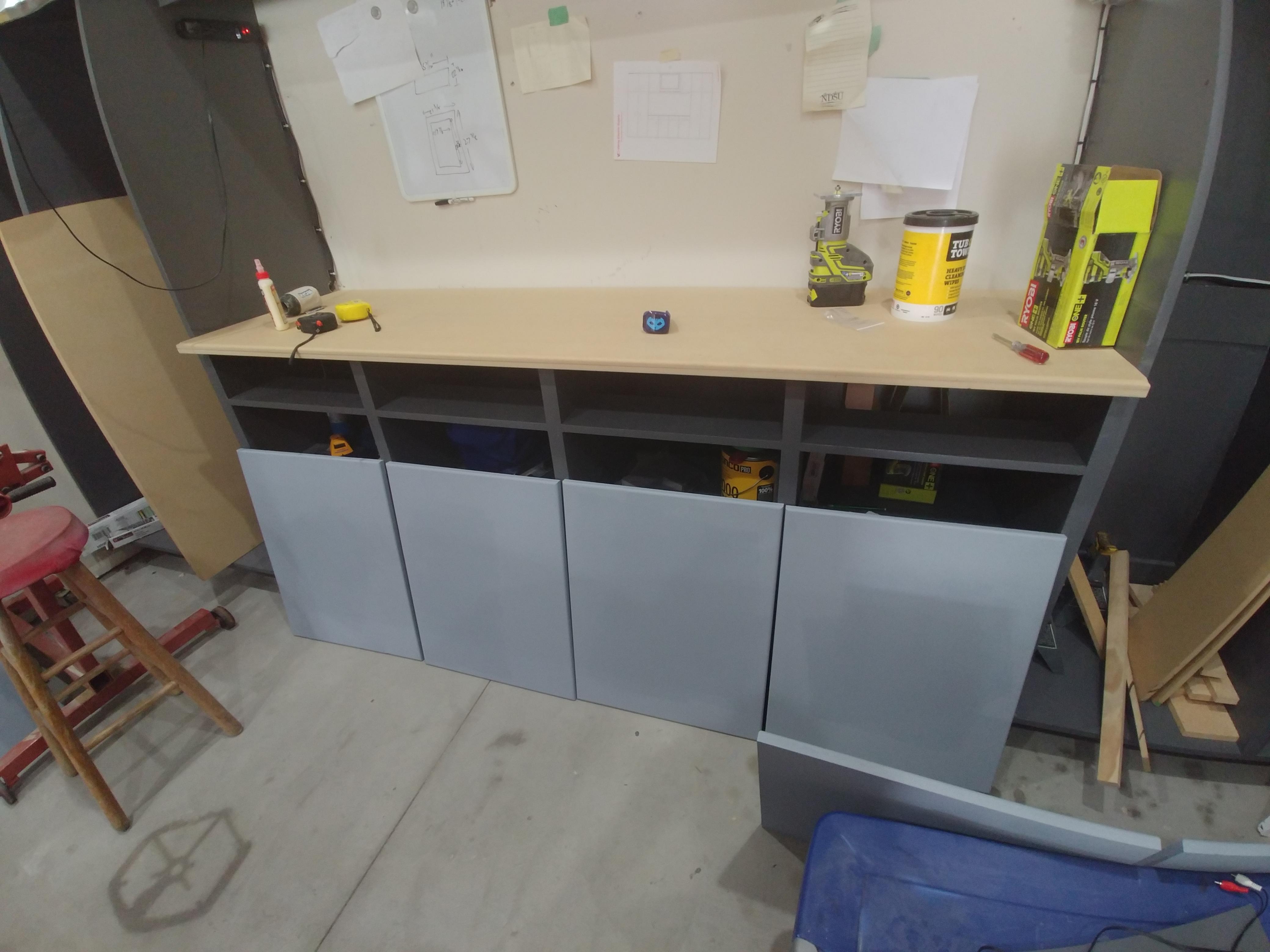 Updated pics. I have all of the cabinet doors cut (except the large doors) and routered. Totally digging this battery powered ryobi handheld router!! I put a coat of primer on them as well. This isnt the exact color they will be painted but in general is sort of close. So this is a preview of how the final coloring will look. Dark grey casings with light grey doors. I ordered hinges off ebay, should be here in a few days.