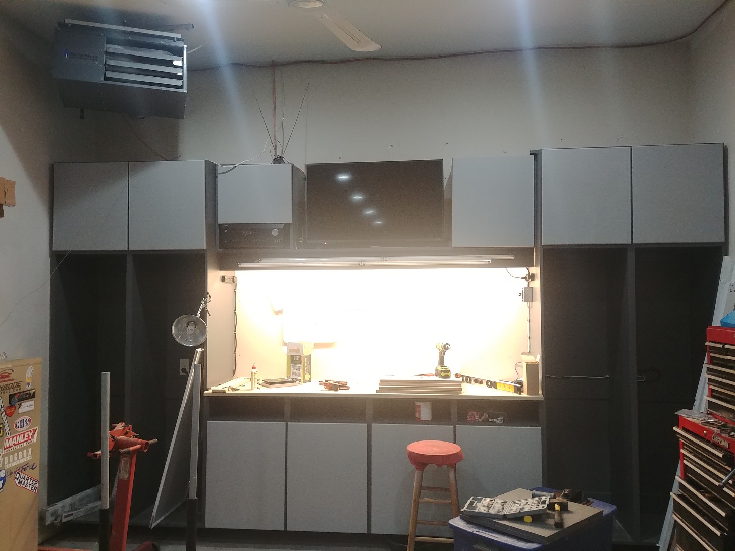 The counter over the shop smith is supported with a 2x4 screwed to the wall, and holds decent weight before flexing. Not going to be a surface to pound on, but plenty strong to hold a bunch of stuff. The shop smith rolls out and fits under the front lip of the counter.