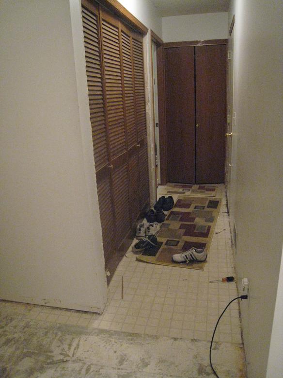 Here is what the entry way looks like right now. As you can see, it's livable, but kinda ugly. The floor is starting to peel up at some of the seams slightly. The walls are covered in dirty finger prints. The light fixtures look like butt.