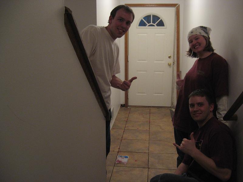 I just found 2 tiles that didn't stick too well so I pulled them up and will have to redo them. No biggie though. we cut a lot of pieces today to finish up the unfinished edges by the front door/stairs/hobbit room. So really what's left is the walkway by the garage door.