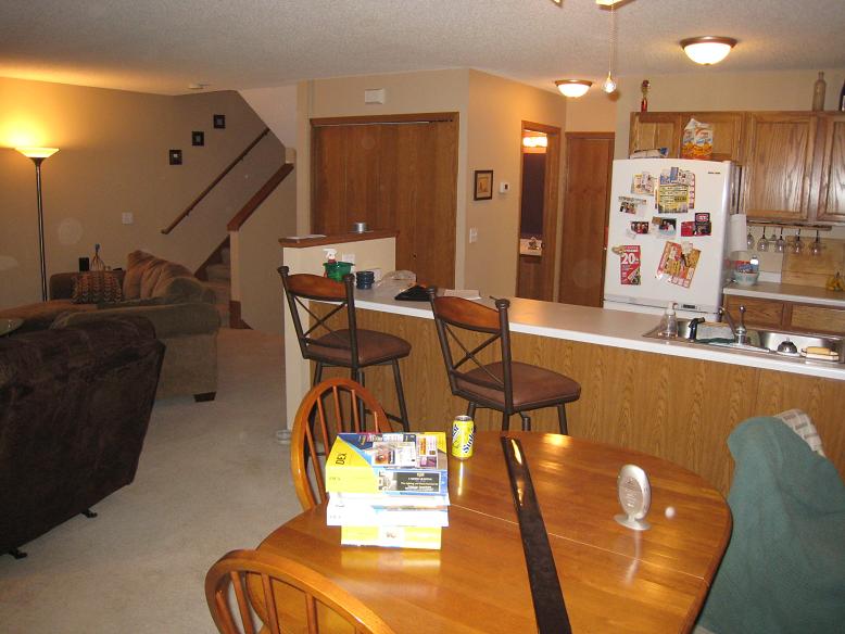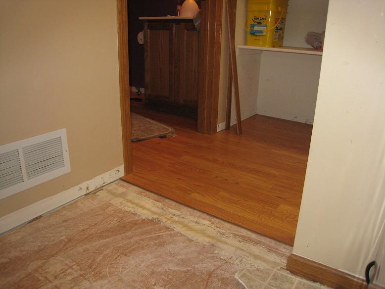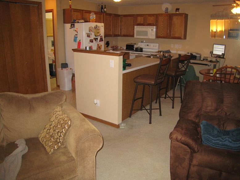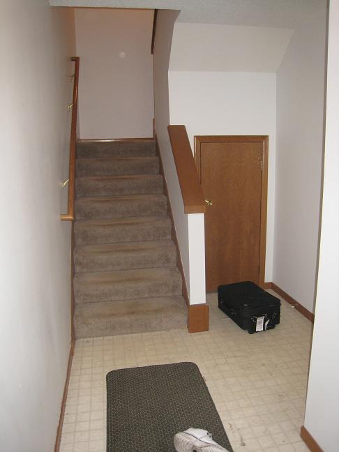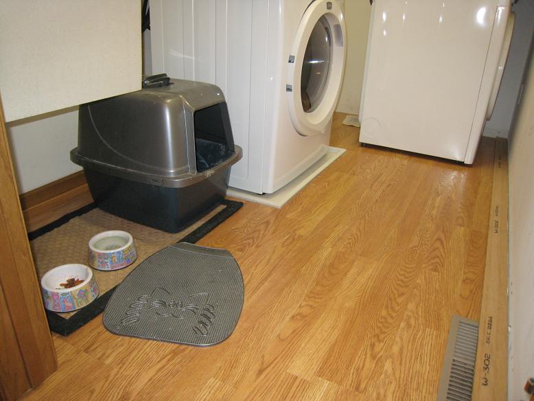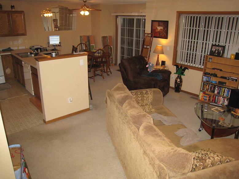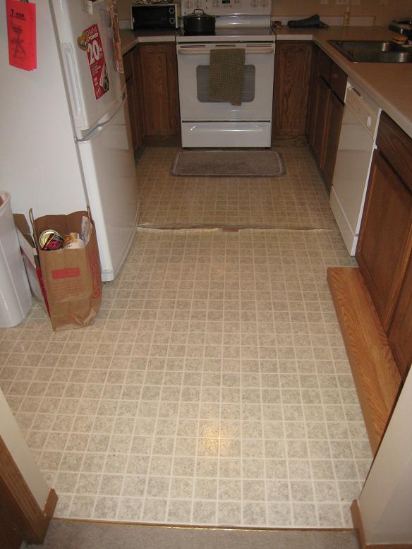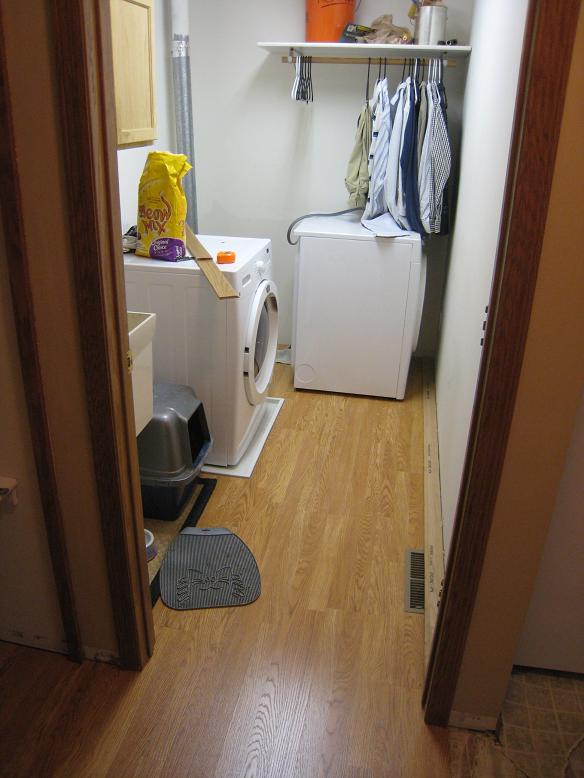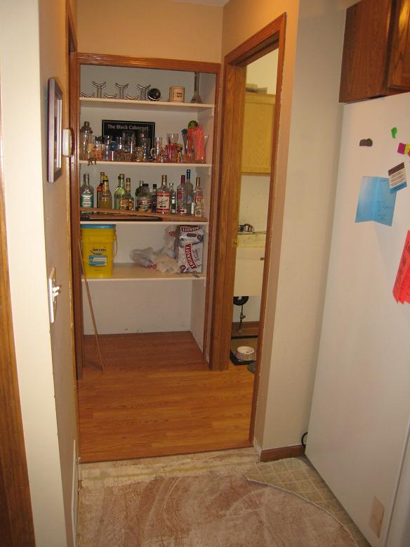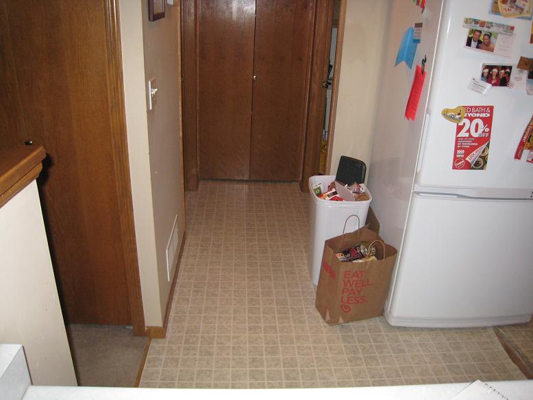 So I decided to get cracking on my main level. Already have the new appliances as I mentioned earlier (fridge, stove, microwave, dishwasher, clothes washer/dryer). So now the first step is to replace the kitchen flooring that is trash. I had a bunch of Home Depot gift cards, so I just went and bought a bunch of Light Oak Pergo flooring that will be going in the kitchen/bath/laundry. Also I am eliminating one cupbard spot. Reason for that is the way it's setup right now makes the dining room huge, and the TV/couch area small. Moving that end over one cupbard spot will help eliminate that. Then once the counter is modified, and the flooring is in, I'm going to get the whole room and the stairway coming up to the main floor re-carpeted.