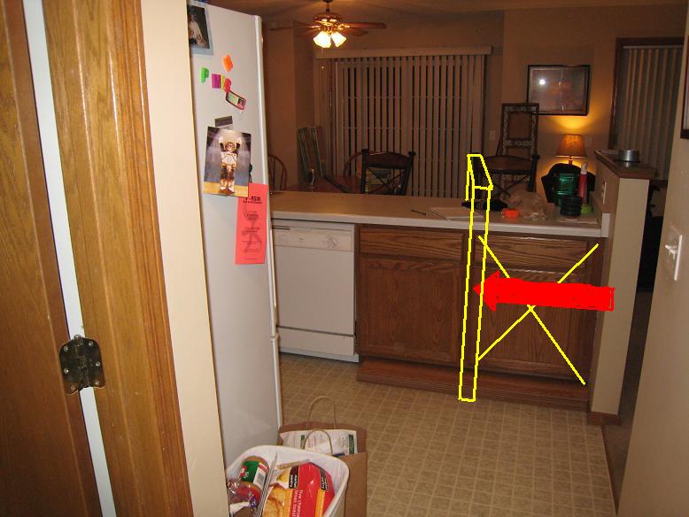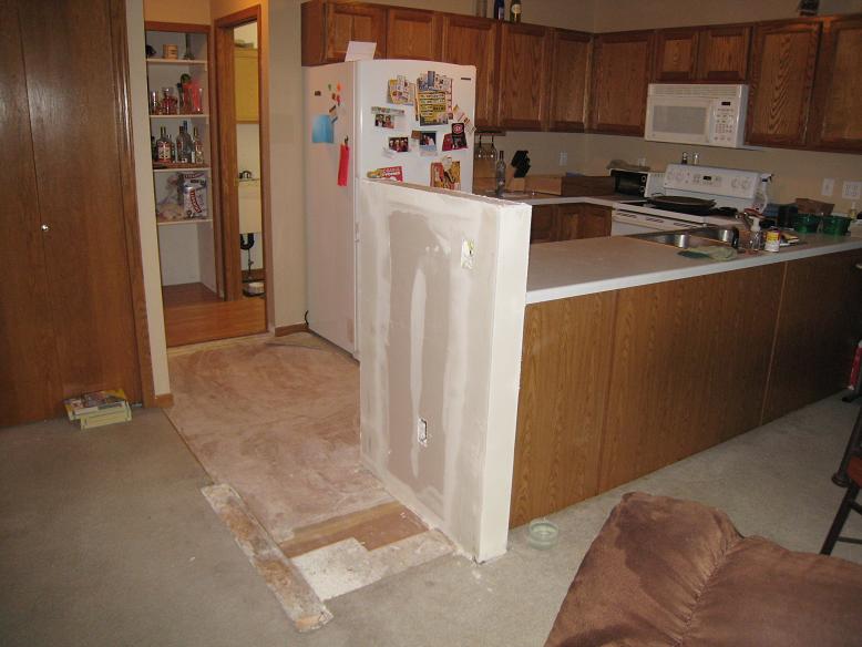 Well started spending some more of my tax return. Here's my current mess I'm living in now. The counter was cut back 1 cubard space like I showed above, and built a new end cap wall on the end of it. Mud is currently drying. The room already feels so much more open now with that counter cut back. It made a huge difference.