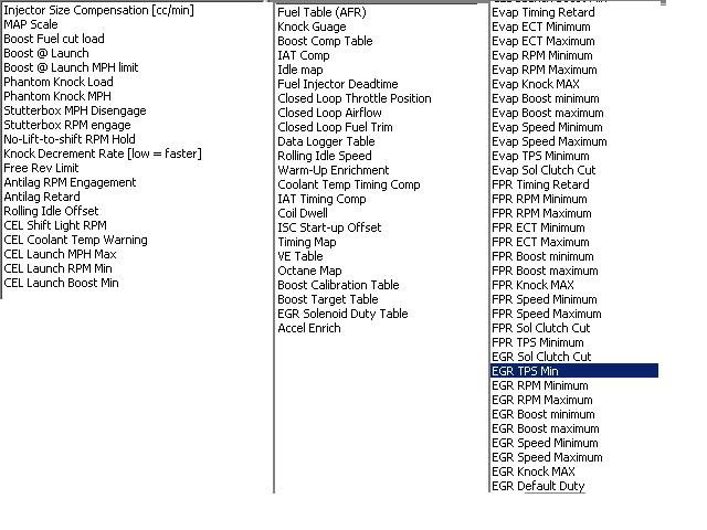 I attached a pic of some table lists and such. Studderbox, NLTS, speed density, boost control vs mph, phantom knock, nitrous control, etc. Most of the same stuff that Evos have now plus some generic outputs for whatever you want. No alt map, but you can put 2 tunes on 1 chip and have them switch via a wire like how you activate alt map.