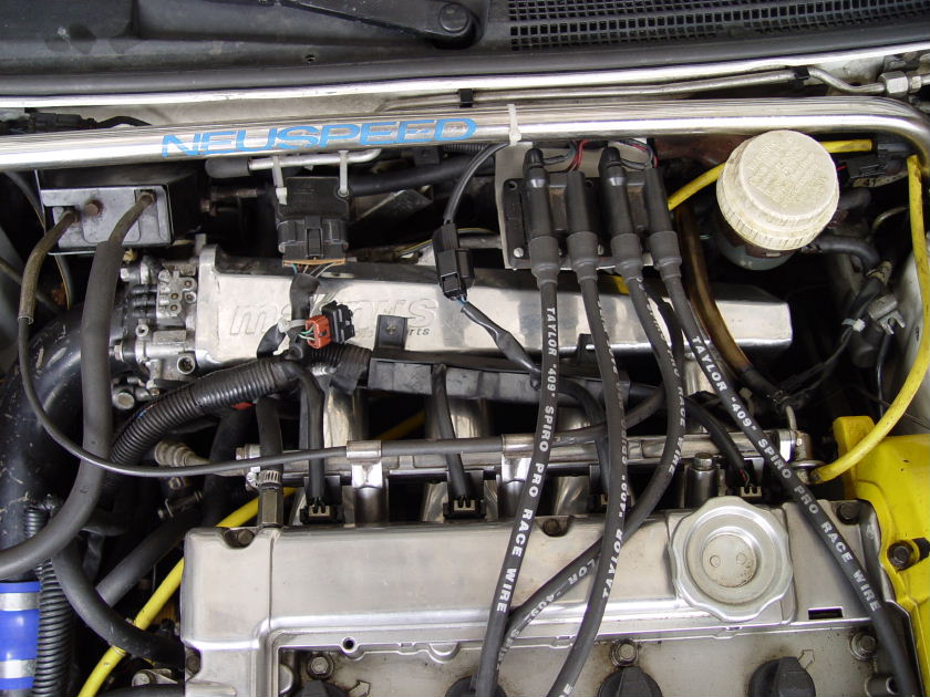 although TT Jake came to my house a few months back with a simular issue. Not sure if 1G's have this or not but on the 2G the sensor that is to the left of the coilpack in this picture went out twice on him and was causing the same symptoms. (the one that is infront of the "NEUSPEED" stickers) - it normally bolted on the intake of a 2G.