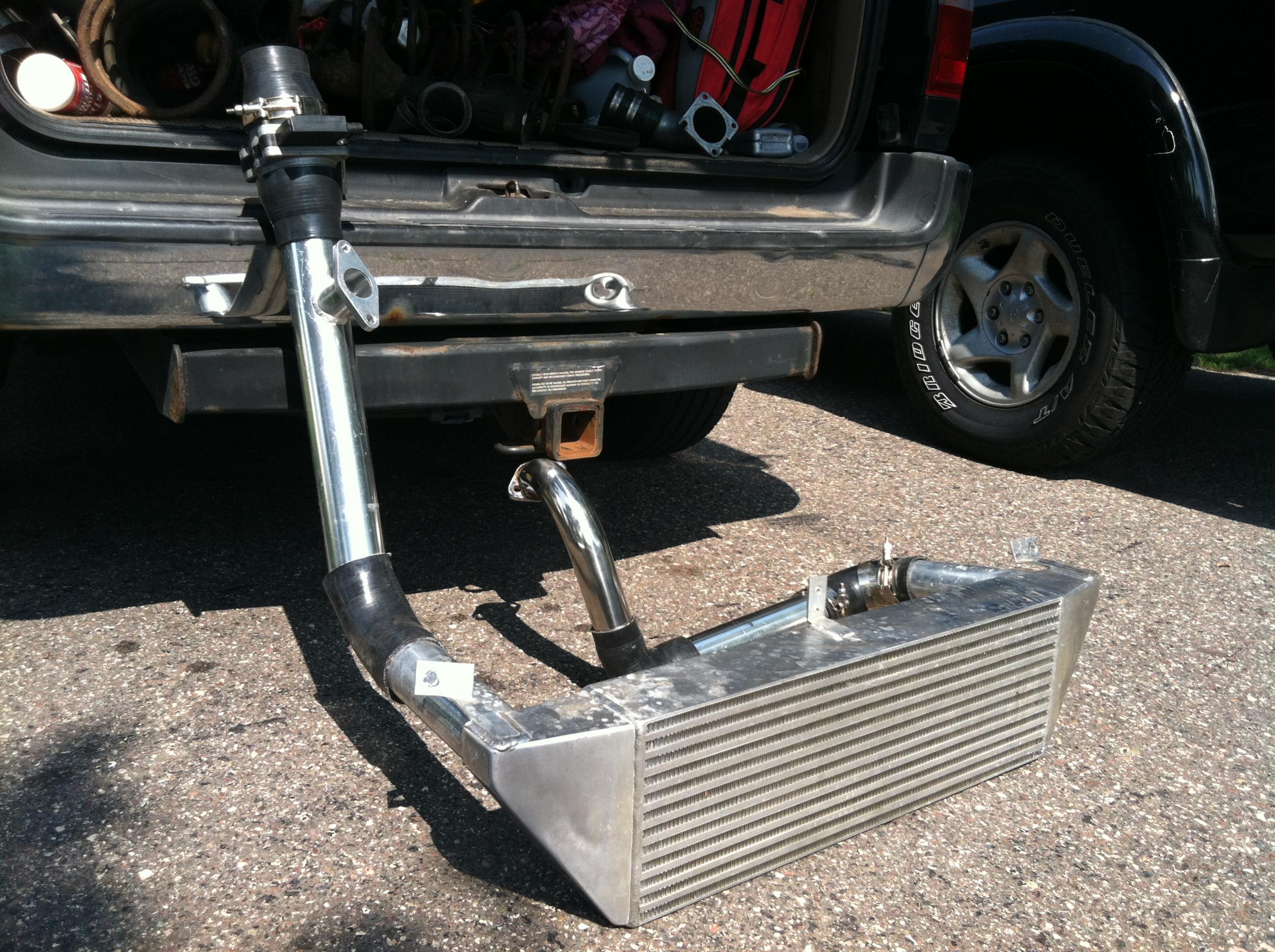 I bought this kit from a guy on here 2 1/2 years ago, never got to install it since my car coincidently dies whenever I had time to install the kit. I believe the guy that I bought it from only ran it for a year or so. Kit looks pretty damn good, no bent fins, minor scratches but still shines! (GMmaf in pic not included)