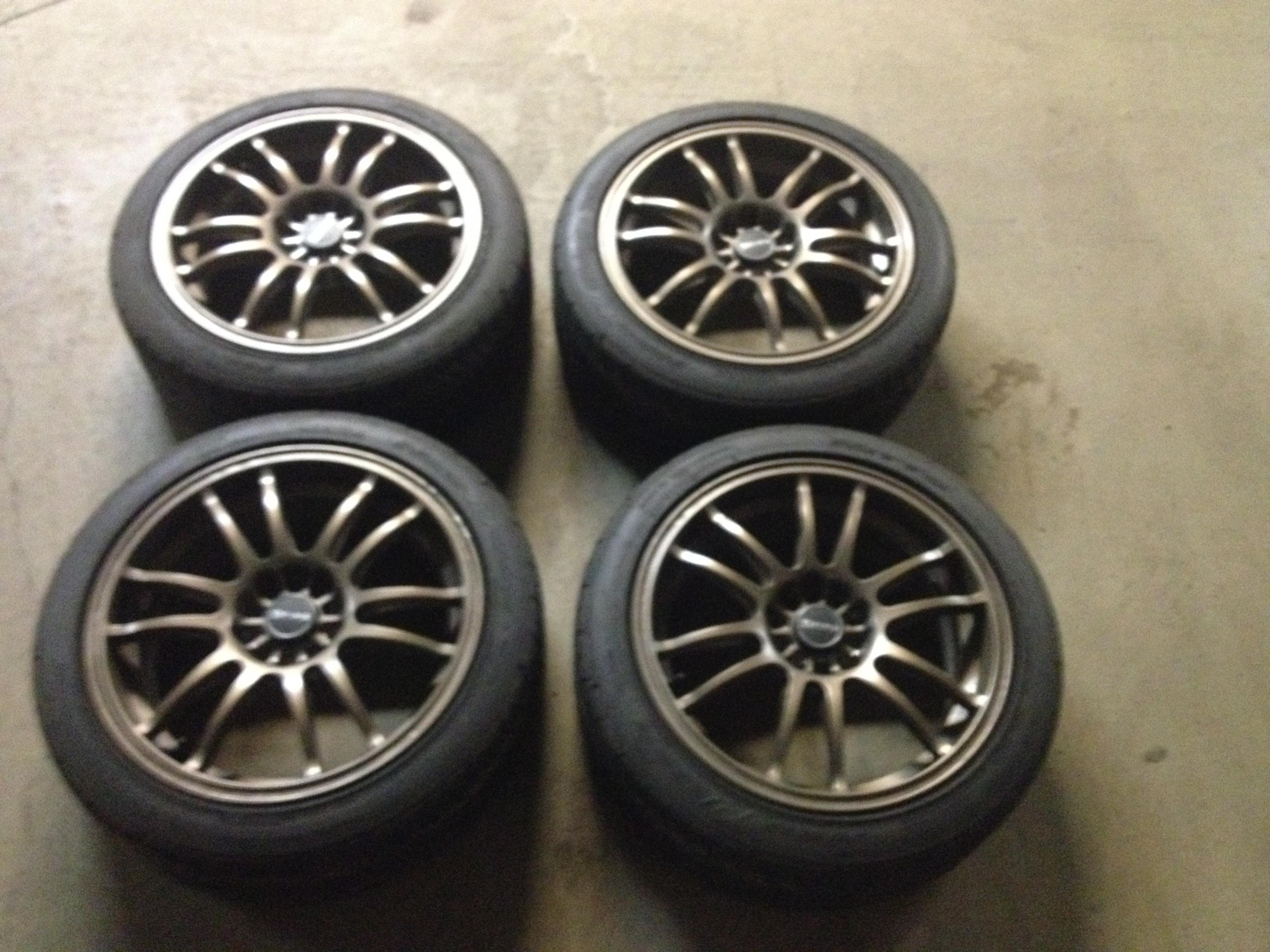 These came off the girlfriends' car. I'm selling a set of 4 Bronze Drag DR-38's mounted to Nitto Neo-Gens (stock Subaru WRX size of 215-45R17). Tires are all around 7/32-8/32 in tread depth left. 5x100 bolt pattern. I believe these are also +48 offset. Also will come with blue deep socket lug nuts with key (no picture shown of lug nuts). They came off of a 07 WRX. 2 summers on the tires, 1 summer on the wheels