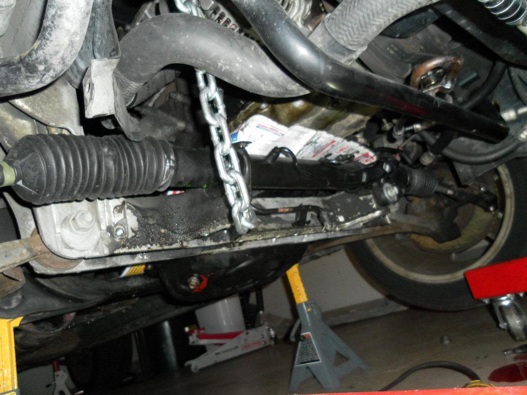 Didn't get a whole lot done. What I discovered is it appears to be impossible to completely remove the lower oil pan without either removing the engine, or removing this big arse cross-member. I needed about another 1/4" but couldn't jack the motor up any further to get that extra little bit. Oh well.