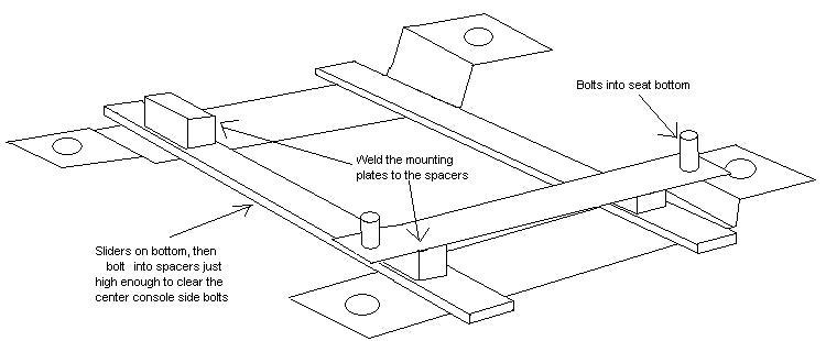 http://mitsustyle.com/forums/attachm...5&d=1240896536 These are very nice brackets, but they sit up higher than stock, plus those rails make it even higher. The problem really stems from the floor being uneven, the inside is about 1" higher than the outside, dumb design. I suppose if I did a fixed position seat they would sit about 1.5" lower. Then I got to thinking how I could make a sliding seat sit just as high as a fixed position, just a hair over the front studs and rear bolts. For the current seats I could bend the cross bars down in the center, but that wouldn't work for seats that had wider mounting points for the rails, because they would have to sit directly over the mounting bolts. So I came up with this design: http://mitsustyle.com/forums/attachm...6&d=1240896536 The rails themselves are positioned as wide as possible on the flat part of the floor. Then add spacers in the front just enough to clear the studs, and a little bit of spacers in the back to clear the bolts. On top of the spacers weld full bars across in the places where you need to bolt on the seat bottom. This will allow any diameter of seat rail mounting points, and will allow the seat to sit basically as low as a fixed position seat. I'm just sharing this with others that might want to make brackets instead of spending over $200 on premade ones that look like the current ones I have that sit up high. Feedback is welcome, I'd love the improve the design further. Maybe someone has already designed this, but I couldn't find anything. |