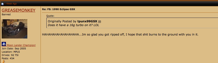 http://mitsustyle.com/forums/attachm...1&d=1276367243 Add into that the backstory by following tom's epic failure of a project thread (but good for you buddy!): http://mitsustyle.com/forums/showthr...t=25528&page=3 And mix in several of the problems being caused by a misleading (dare I say lie?) of a classifieds ad: http://mitsustyle.com/forums/showthread.php?t=25399 The decision for what to do was simple! I put tom in charge of deciding GREASEMONKEY's fate: Quote: