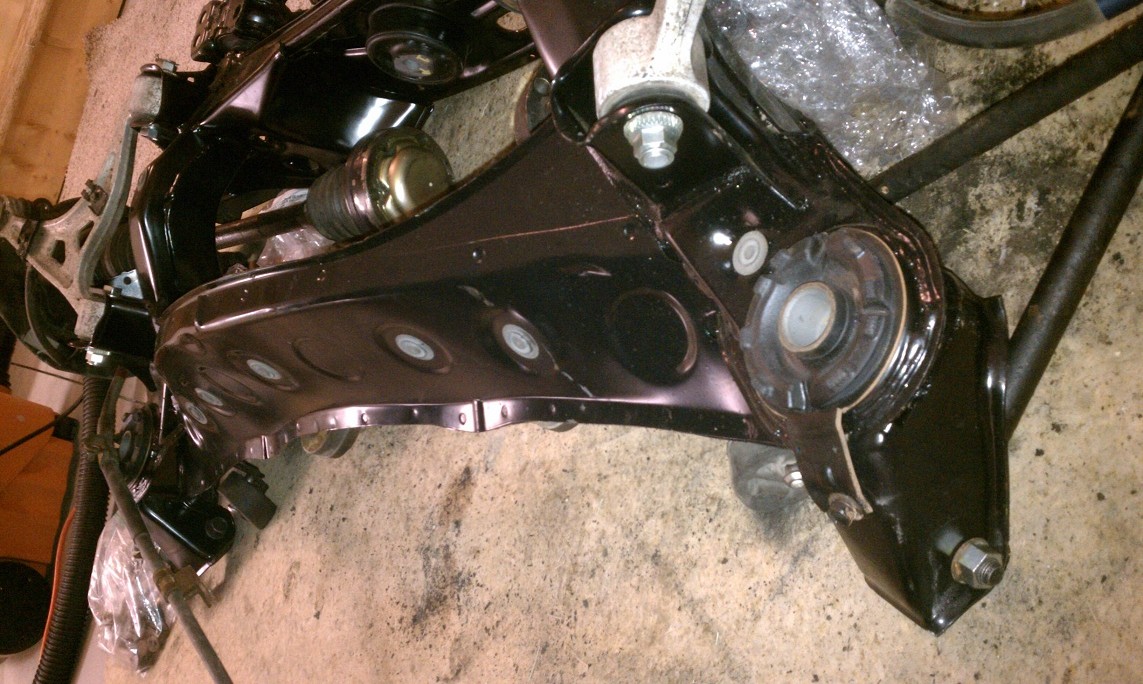 Started putting the rear sub-assembly back together. Really liking the fact that I bought new hardware to replace some of the rusty bolts. However they screwed up and sent me the wrong two cam-bolts for the lower control arm. So I have the old rusty ones in there for now until they send me the correct ones.