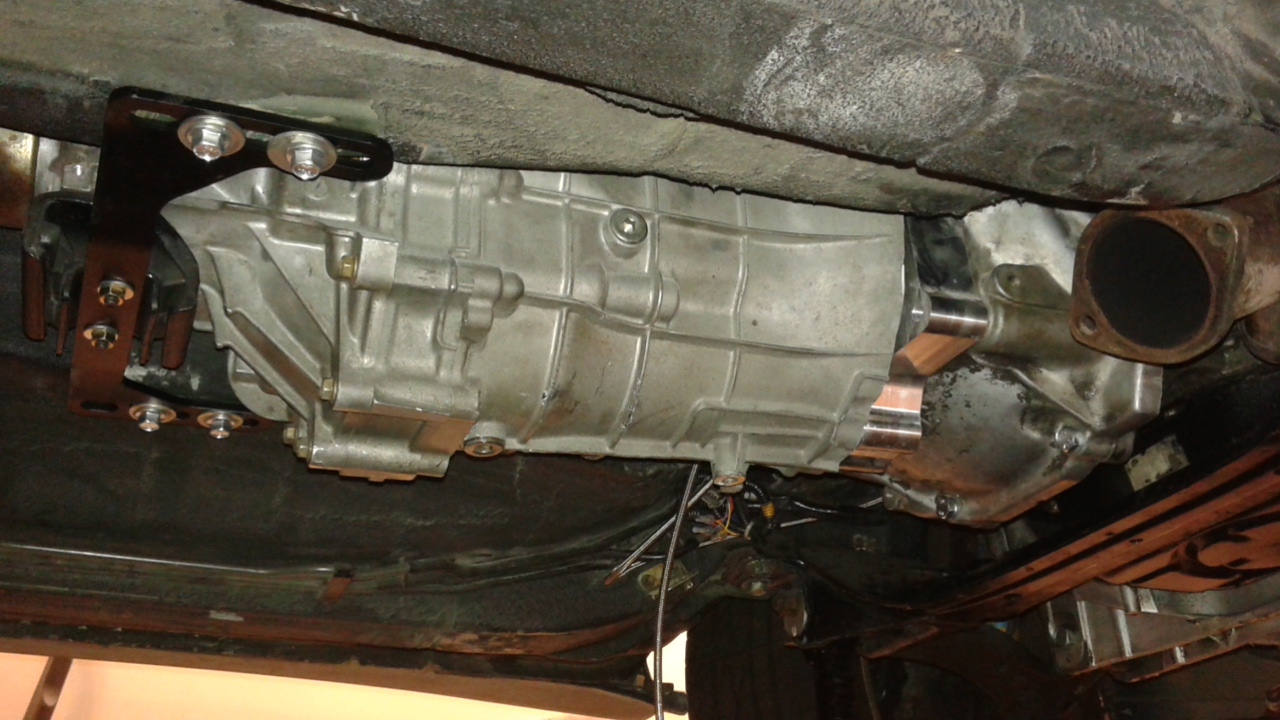 Also, got the transmission in. So this is the new Collins A340 adapter kit. I also got his new transmission mount and ditched the old version. Routed some Power Steering line for the new PS reservoir. Good thing I got my helper cracking the whip. He loves his hoes!