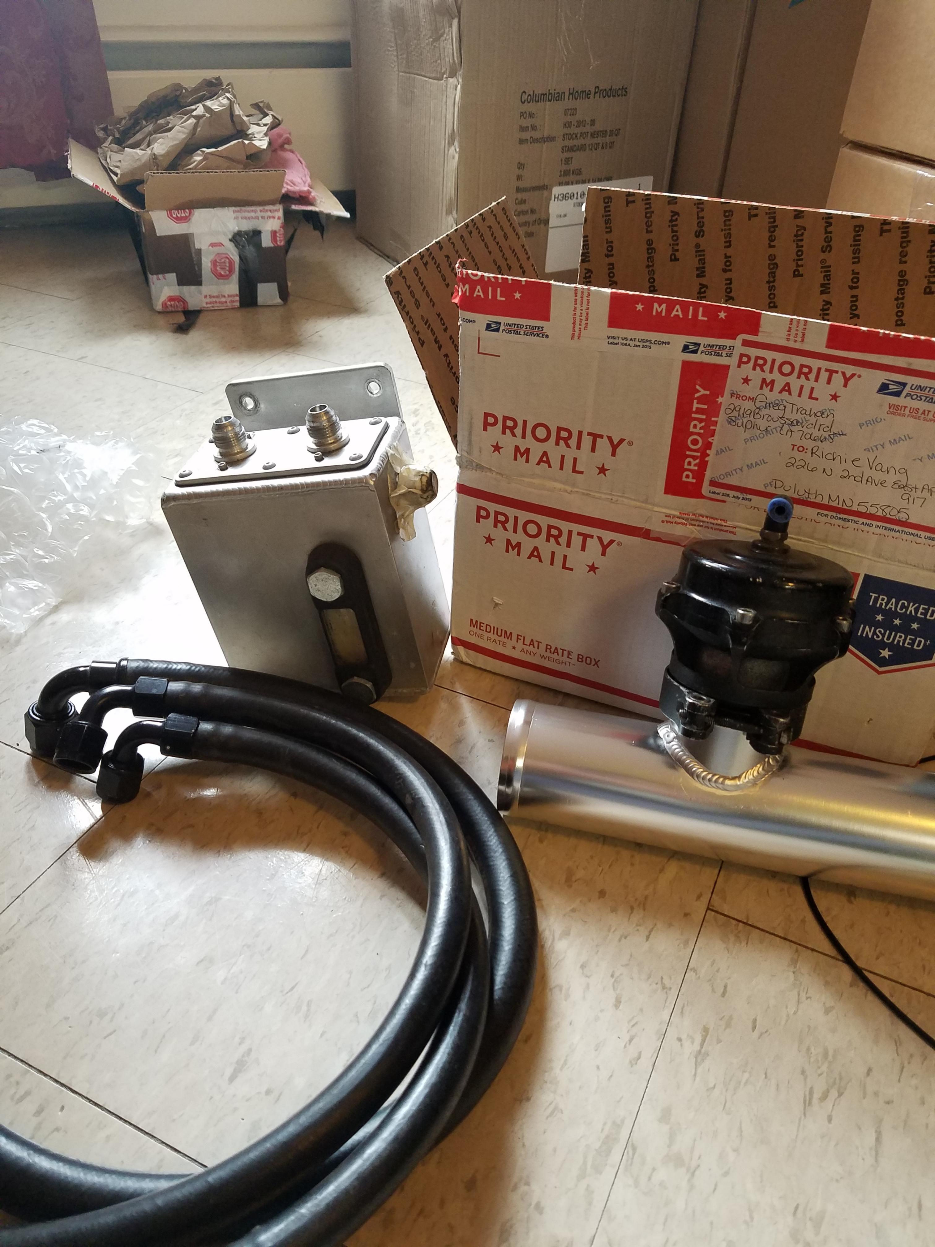 I am pretty sure they are -8an inlets and -10an outlet. I can double check when I get home Saturday. It was used for 6 months and has the 3in window. I paid $200 for the can+fittings/hoses, I'd like to get $200 back. You're technically getting the can for ~$150ish. I'm not going to separate the fittings/hoses.