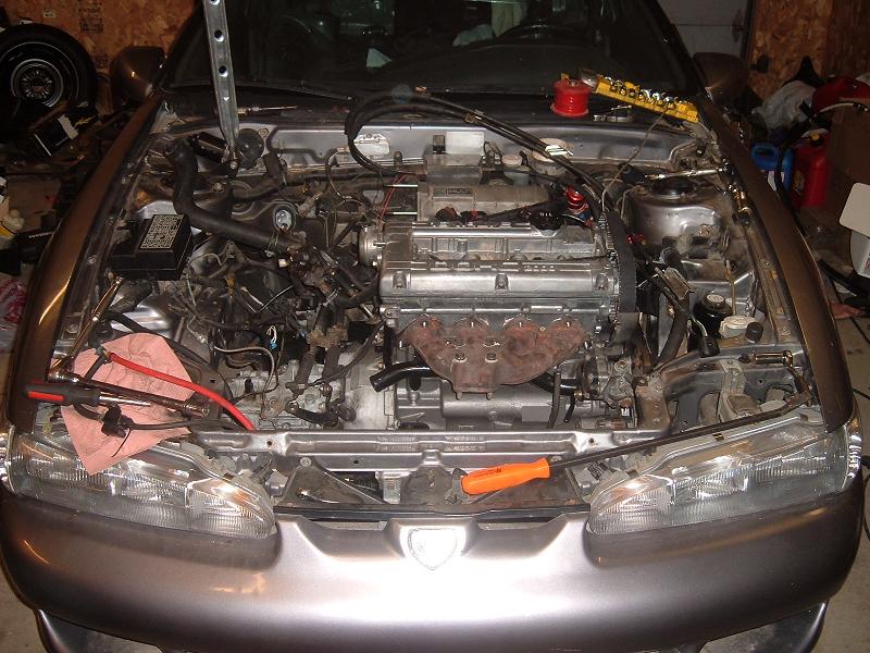 For those that don't know, that is a 2.4l with Wiseco 8.8:1 pistons on eagle rods. Majorly ported head done by myself. HKS 272 cams, Crower springs and retainers. No balance shafts, plugged balance shaft oiling holes, and deleted or cut down brackets on most everything.