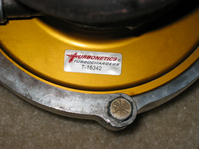 The only place where it says turbonetics on the actual turbo itself is on the back plate of the compressor cover. It has a sticker that says turbonetics and a part number or serial number.
