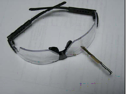 The employee was using a nail gun to secure stopping tracks in a truck before a shipment. he heard a weird noise when one nail came out of the gun and bounced off a metal object. When he stodd up he thought he had a spec of dirt on his glasses from the inccident but as you can see it wasn't. Can you just imagine how that would of ended up?