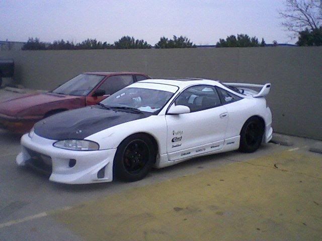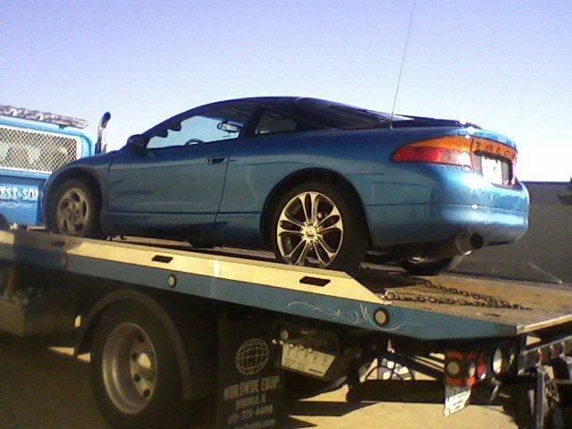 I got a little story about this guy.. First of all you can see his rims.. He's got 17's in the rear and stock's in the front on his AWD talon. He lives in an apartment complex next to me and I always here his VENTING bov every time he drives out. This thing is stock except for an exhaust. So as he pulls his car up on the flat bed I talked to him. Long story short he said he is going to swap a 7 bolt into his car before he sells it. So I ask, "Oh, so you got a 6 bolt in there then?" He says, "No, I'm swaping out the 5 bolt (Yes he said 5 bolt) to a 7 bolt cuz I dont want this shit to crankwalk on me." Once he said that me and my friend walked away trying not to laugh, but it was tough! So anyway, here's a cell phone pic of the beauty!