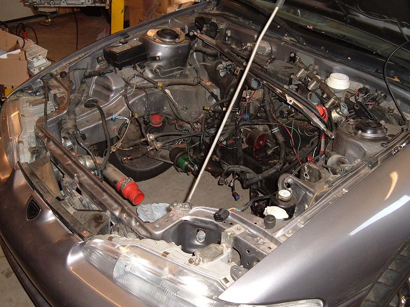 For those that don't know, that is a 2.4l with Wiseco 8.8:1 pistons on eagle rods. Majorly ported head done by myself. HKS 272 cams, Crower springs and retainers. No balance shafts, plugged balance shaft oiling holes, and deleted or cut down brackets on most everything.