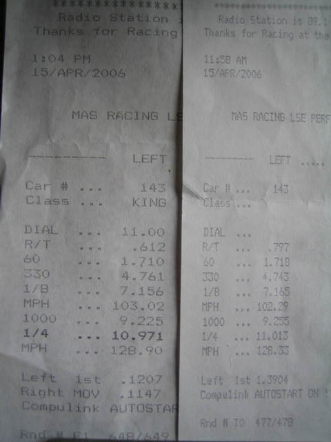 Yesterday the Eclipse finally ran a 10 second pass at the track with the FP3052. The 60ft times were low 1.7s. After about 15 passes and a few issues involving crappy driving the car finally ran a 10 second pass. The end result was a 10.971@128.90 and it was backed up with a 11.013@128.33. There was no nitrous used, the boost was at 31psi, AFR was around 11.9:1, timing maxed about at 18 degrees and the car weighed 2980 with driver.