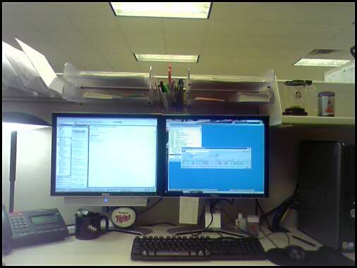 Dual 21's here too. Except I have one LCD and one CRT. The CRT has a lot better resolution for the CAD stuff. I'll post a pic someday.