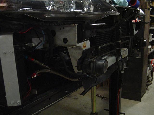 I don't think anybody would want to fit a bigger core to the front of a 2g. It takes up just about all of the available space, unless you really want to hack up the car/bumper. Although the LICP is 2.5 inches, we jumped it up to 3.0 at the inlet to the core, just in case I ever needed to go bigger it would be as simple as replacing the LICP. The pipes were trimmed to the shape of the tank openings so there would not be any pipe protruding into the tanks. We are running 3.0 inch up to the TB elbow. Still haven't decided which TB I want to go with yet, I'm working on that, but it will be done later. The tanks are made from .090 aluminum. We pressure tested it @ 42psi to make sure the welds would hold and check for leaks. We have engineering templates made for the tank panels that I'll try to scan and post later if anybody wants them. We cut the lower part off the bumper support brackets to make room for the intercooler pipes as seen in the pics. Everything will fit under the bumper and retain the driving/fog lamps. I'll post more pics as we go.