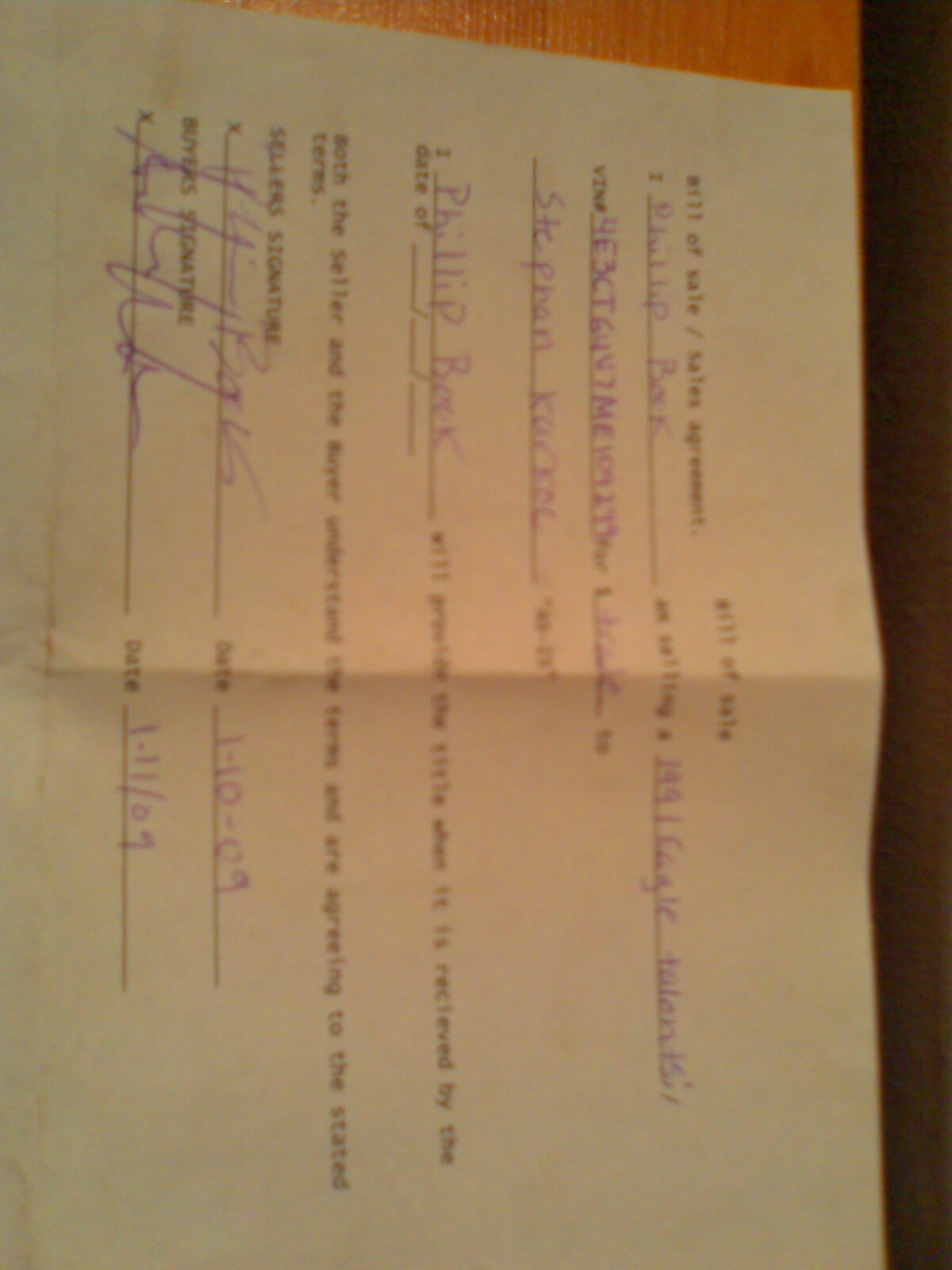 So he limped the talon over to my house where we swap wheels and the steering wheel and do the paperwork. He didnt have the title yet and i was fine with that so i typed up some bills of sale and told him that when he gets his title we will just swap.