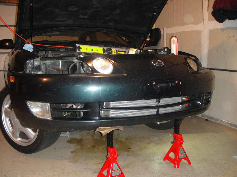 Initial mock-up of the FMIC is done. Couple notes are that there is a TON of room in here to fit this thing. 4" thick intercooler, and zero trimming of the bumper will be needed. Also I ensured to put it high enough so that the bottom of the FMIC will not be hanging below the bottom of the front bumper, which I made sure of because I've seen quite a few other ones setup like that and it looks weird IMO. I got it perfectly level at the moment (made sure the car was level first). Also I took a picture to show the gap between the FMIC and the A/C Condenser. Lots of room in between there. I would have pushed the core back further but the A/C lines would then be blocking one of the inlets of the FMIC, so that is why it is placed exactly where it is. If I could have tucked it back further, I may have been able to retain the factory coolant reservoir but nope, so I'll just be using the old reservoir from my Talon. There's 2 horns. I remounted one a little more out of the way, and the other I will either remount, or just remove as I don't feel like I really need 2. It alsoit looks like I will be able to retain the stock crash beam, but for weight reasons I may just leave the sucker off, we'll see And lastly, doing this made me notice part of my bumper is broken (you can see in the very center the plastic grill piece is broken in the center) ghey, but whatever because eventually (probably not unilt next year) I plan on switching out the the 97+ bumpers so not a huge deal.