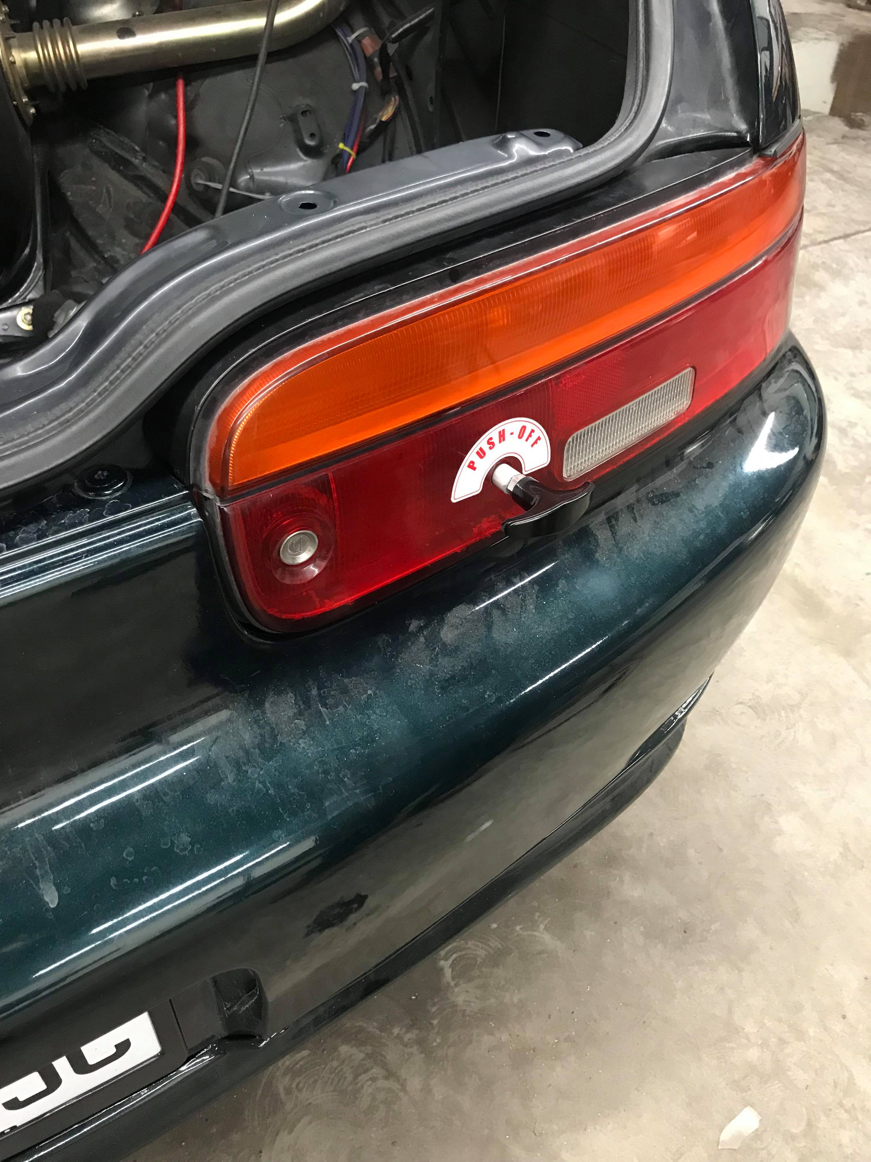 So anyways, here's where we're at. The motor is in obviously. He's fabbed up the new 1pc aluminum IC piping (2.5" hot side, 3" cold side), nice rolled lips, and powder coated texture black. Photos look on point! He made a new fuel tank top hat for the new dual 450 pump setup (1 always on, other turns on with AEM when needed). It'll bolt up to factory feed and return for now, but setup for running larger lines in the future. 1ZZ COP brackets he made and powder coated, all installed. Battery relocated to the trunk using a full sized SC300 battery. Fastened downed and properly mounted in a battery box. Cut-off switch installed for the track. It's ran through a spare taillight I bought for dirt cheap. The arm is removable so I can just run my original taillight fully functional for 99% of the time on the street. For track day all I do is swap in this other taillight and connect the push/pull arm. Exactly what I had requested, and he nailed it on the execution.