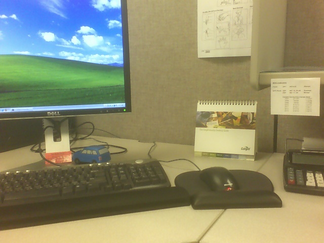 I don't have a office or a cube for work. I am a bank examiner and work where there is room for me. Could be in a big board room, or at a card table depending on the place. I have even sat in a chair that is probably twice as old as I am. I get to work at home a little though.