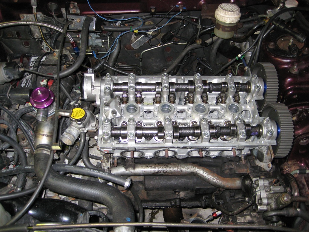 After the head was on I got the intake manifold installed and plug wires routed, as well as all the sensors plugged in. The only things left are to bolt on the turbo, do the timing belt, and put the oil pan back on. It should be up and running by Thursday at the latest.