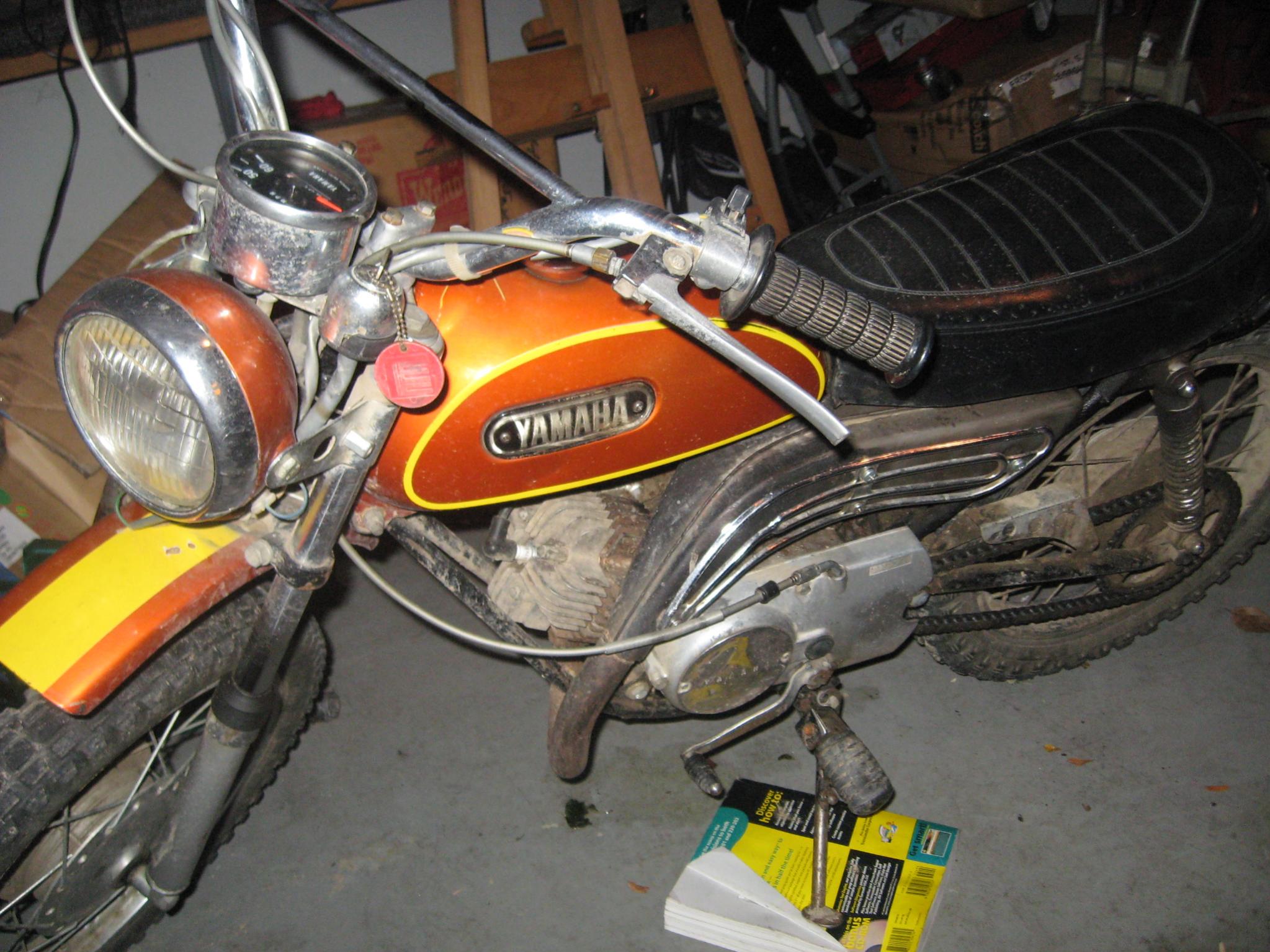 The second is a 19XX Yamaha Mini Enduro. Unsure the size of the motor. This will be also a cleanup resto job. Replace what needs to be replaced. Currently runs. Earlier this year was having trouble running but it ended up that there was no exhaust coming out the tail pipe, as it was completly clogged up with carbon. But we cleaned that out nice. It would be great if i can find a newer muffler for it. or have one made.